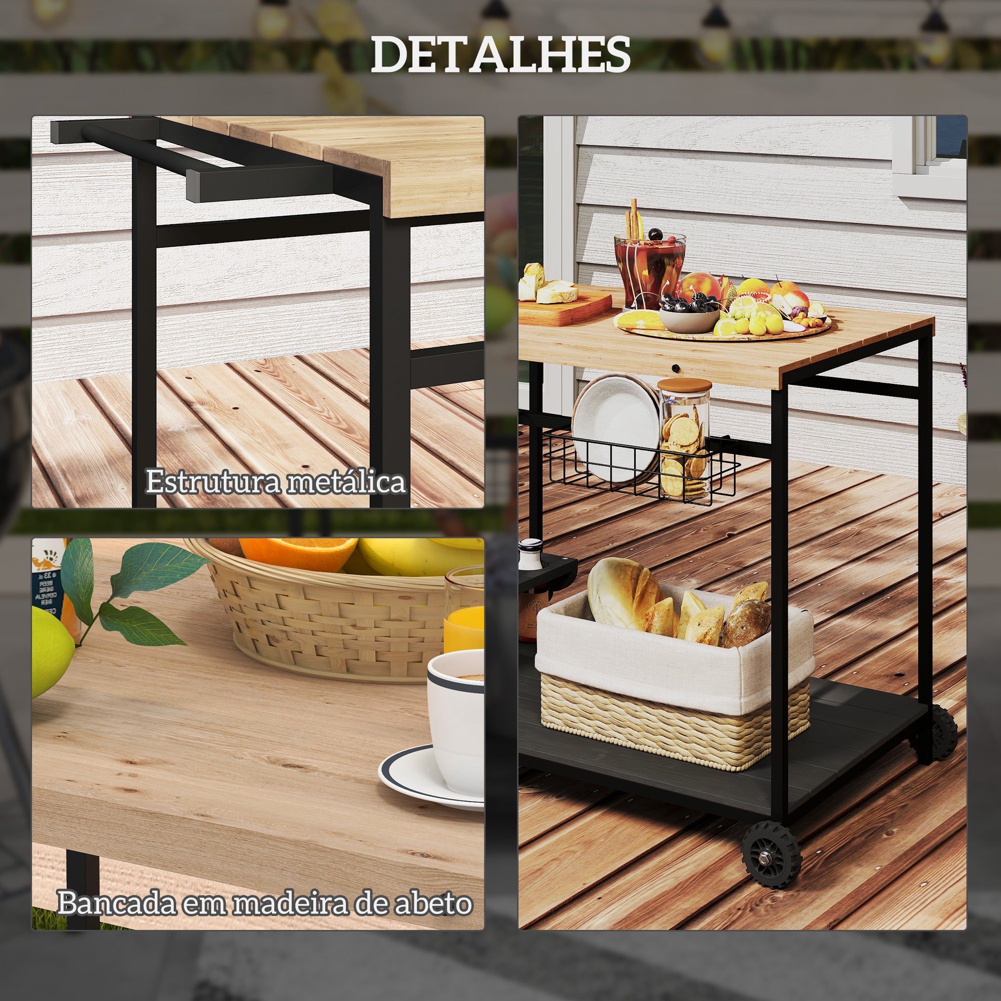 • 1 x Manual de instruções; Receber convidados no jardim pode ser mais fácil com o equipamento certo. Este carrinho de cozinha para exterior facilita as reuniões ao ar livre. A prateleira superior de madeira é ideal para comida e bebidas, enquanto a inferior, metálica, acomoda utensílios e ingredientes. Com quatro suportes para garrafas de vinho e duas rodas para transporte, é um aliado prático para qualquer ocasião