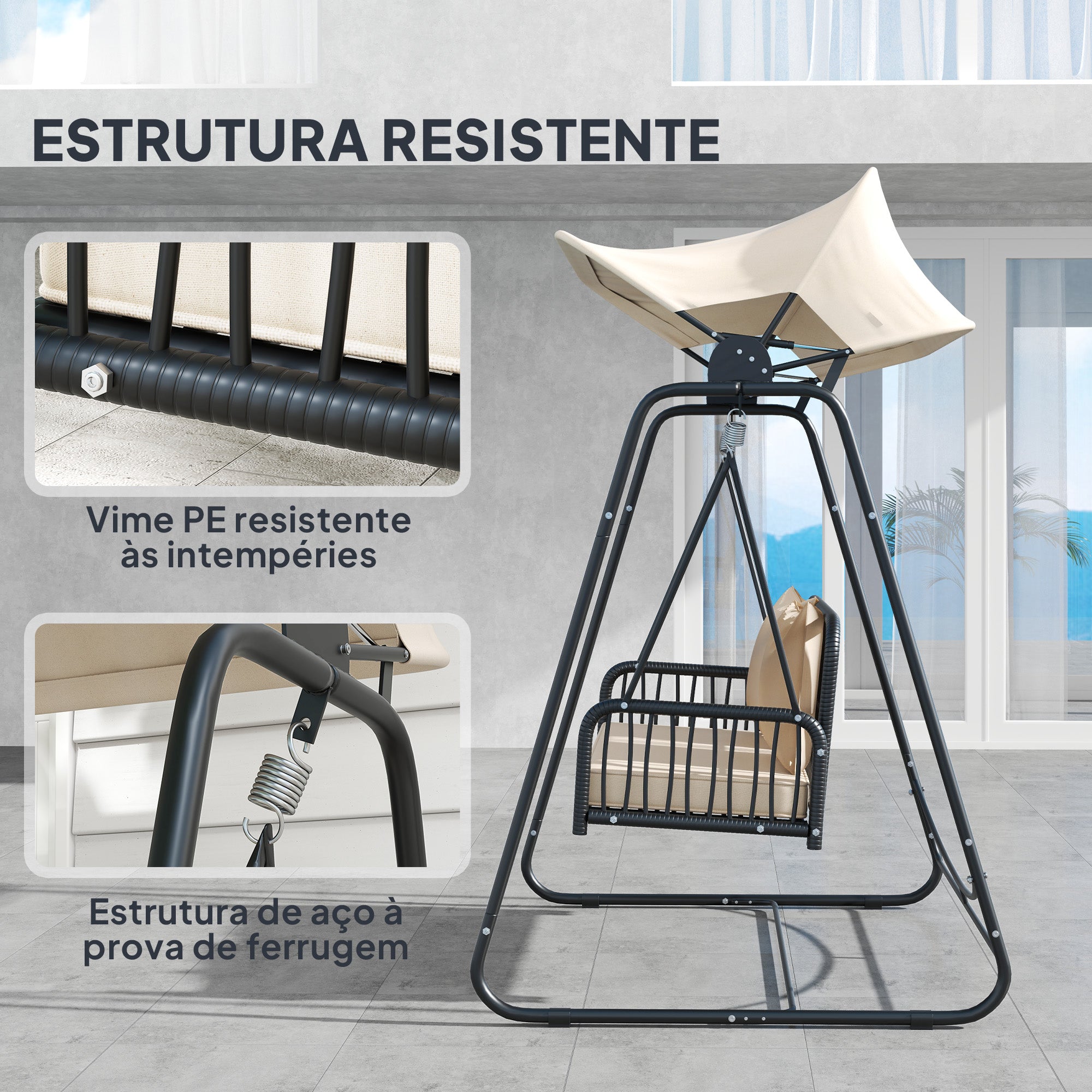 • ESTRUTURA RESISTENTE: Fabricado com tubos de aço revestidos a pó e vime resistente aos raios UV, este baloiço de jardim foi desenhado para evitar deformações e ferrugem, garantindo durabilidade e mantendo a sua aparência ao longo do tempo