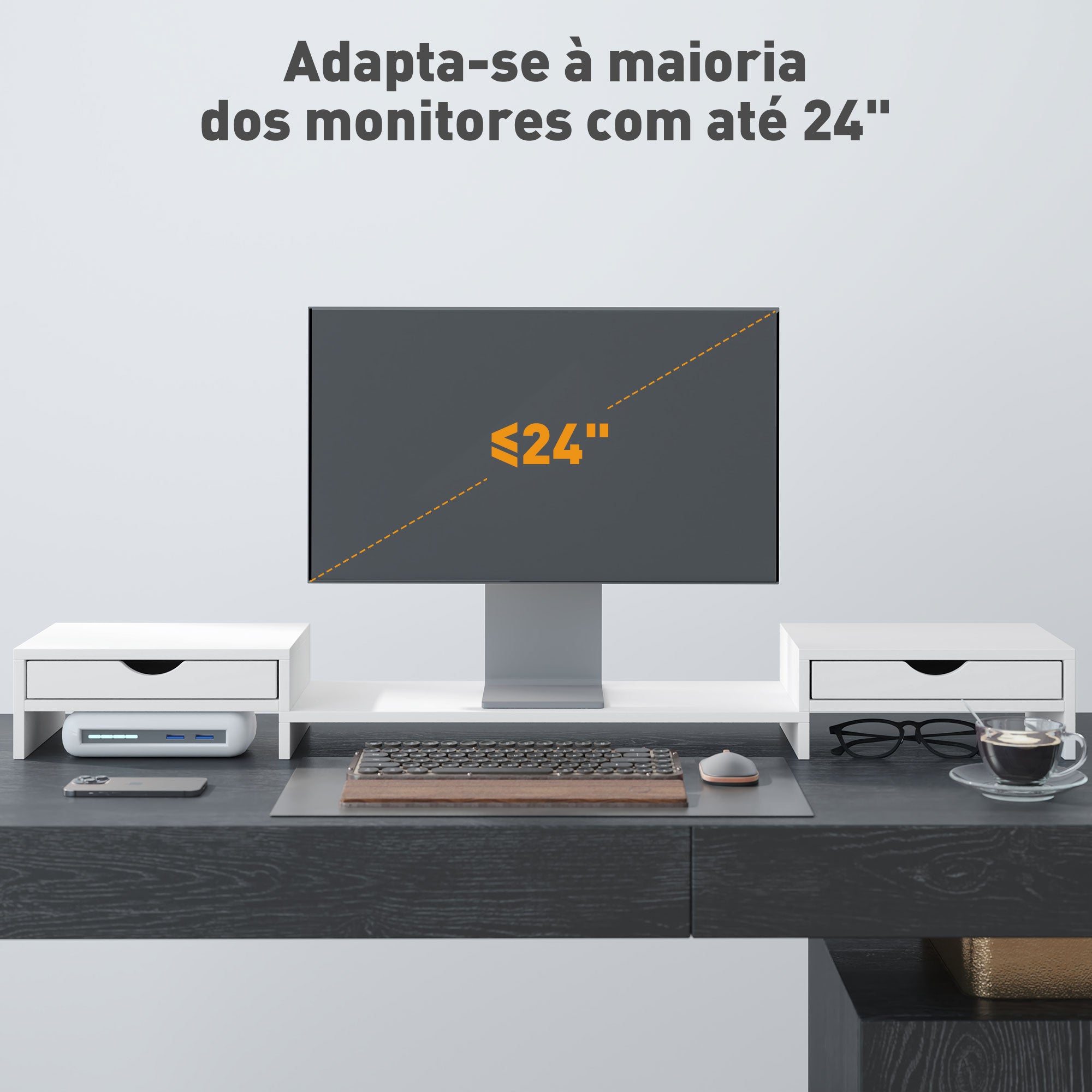 • Comprimento ajustável de 60·116 cm e ângulo para uma visualização óptima, ideal para dois monitores Este suporte para ecrã de computador inclui duas gavetas para guardar objetos essenciais de escritório Espaço adicional por baixo para o teclado e o mouse Eleva o monitor até ao nível dos olhos, reduzindo a tensão no pescoço Fabricado em madeira melamina, suporta até 14 kg Compatível com monitores até 24” Montagem fácil com todas as ferramentas incluídas