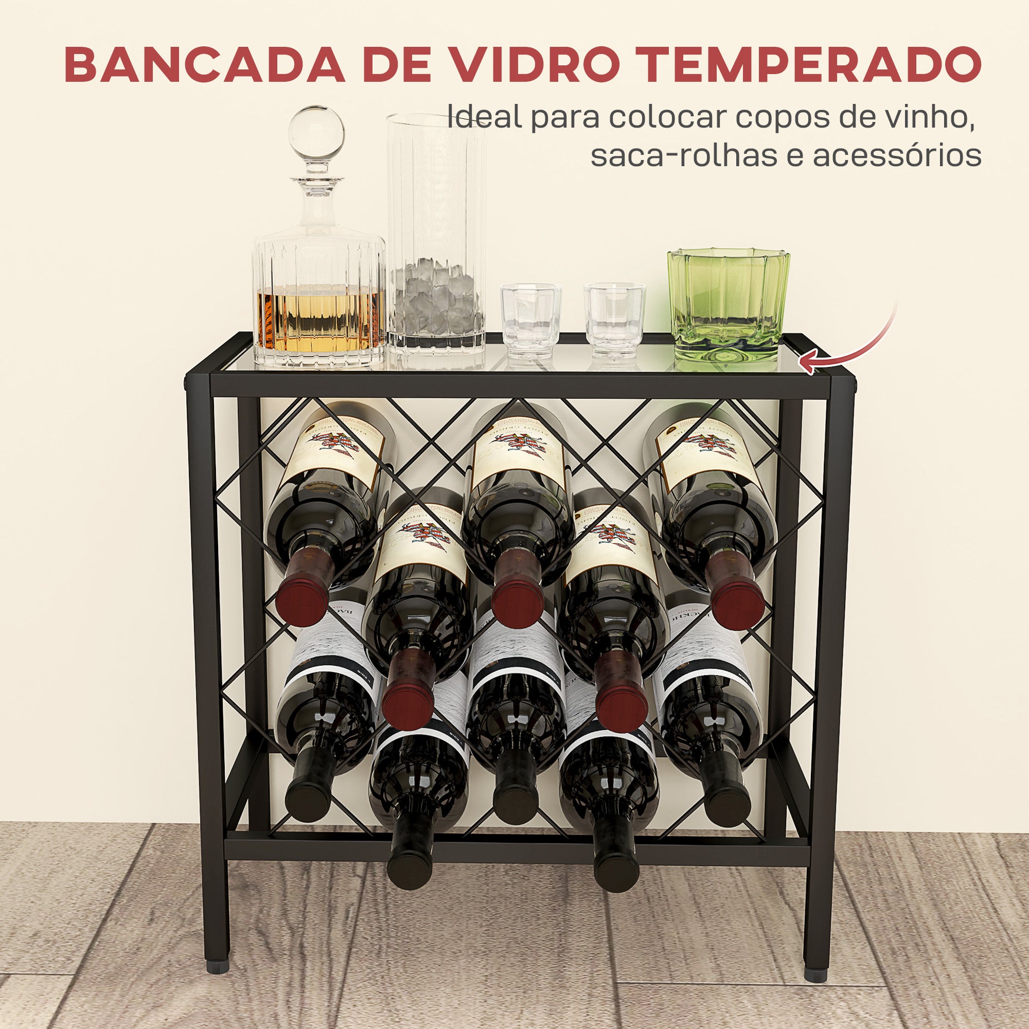Suporte para Garrafas de Vinho para 10 Garrafas Suporte com Bancada de Vidro Temperado e Estrutura de Aço para Sala de Estar ou Jantar 41x22x41 cm Preto
