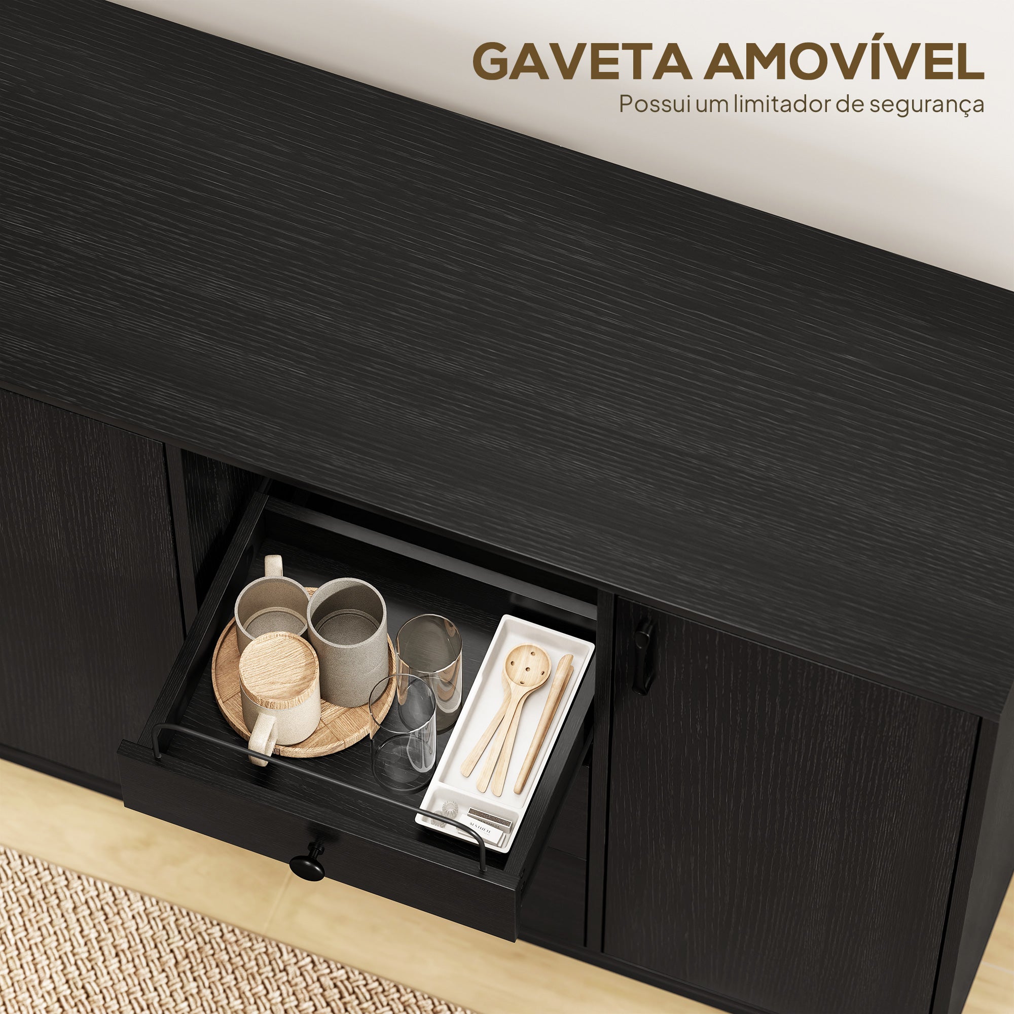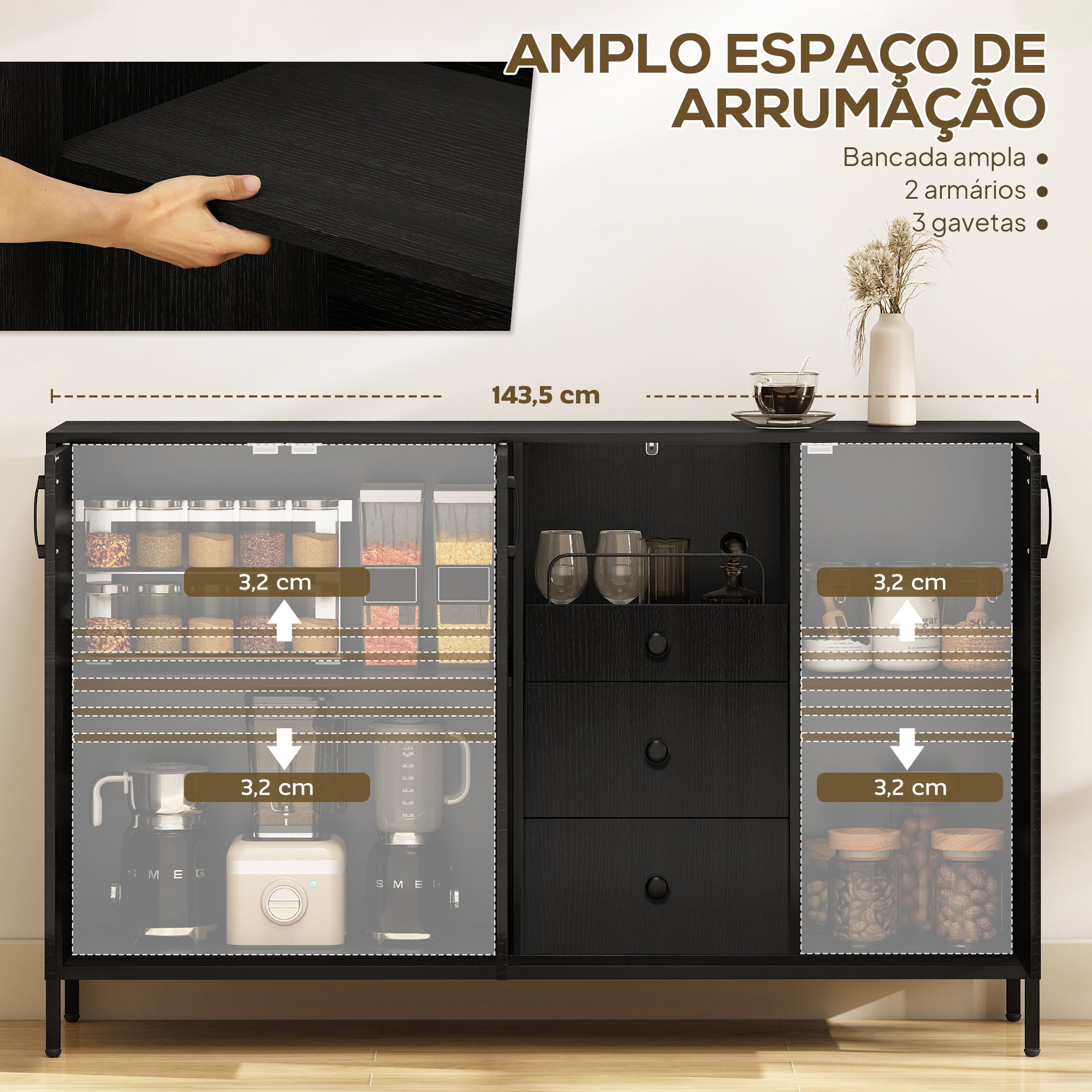 - Este aparador dispõe de um amplo tampo de 143,5 cm, dois armários e três gavetas para manter a sua casa organizada O compartimento aberto inclui uma barra de retenção que assegura copos ou objetos delicados As prateleiras ajustáveis de 5 níveis maximizam o espaço interior de acordo com as suas necessidades Aparador de sala com design moderno em madeira de efeito preto e estrutura metálica que realça qualquer decoração Inclui kit anti·tombo e pernas ajustáveis para maior estabilidade e segurança Graças à sua versatilidade, pode ser usado como aparador, móvel auxiliar, móvel bar, consola de entrada ou suporte de TV A base de 13 cm de altura facilita a limpeza inferior com aspiradores robô Requer montagem