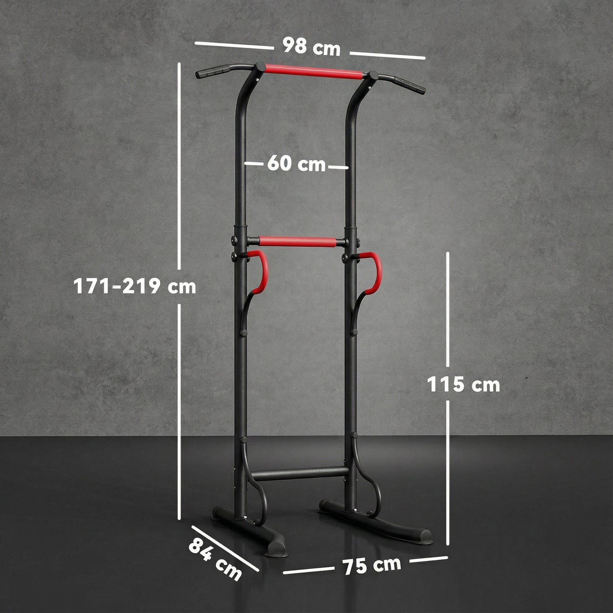 - MEDIDAS TOTAIS: 98x84x171·219 cm (CxLxA). Carga máxima: 120 kg. Requer montagem O pacote inclui: ? 1 x Estação de elevações e flexões; ? 1 x Manual de instruções Treine em casa com esta estação de flexões e elevações da HOMCOM, desenhada para trabalhar vários grupos musculares num só equipamento. Ideal para elevações, flexões, abdominais ou elevações de pernas, oferece diferentes opções de treino. A sua estrutura de aço suporta até 120 kg e garante segurança. Dispõe de 7 níveis de ajuste em altura, pegas antiderrapantes e pés com ventosas ajustáveis que melhoram a estabilidade em cada utilização.