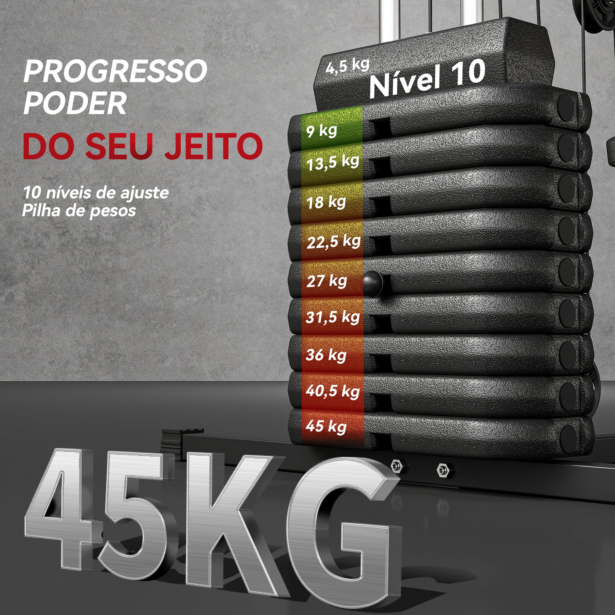 - TREINO COMPLETO: A nossa multiestação de musculação para casa inclui pilhas de pesos de 45 kg, ajustáveis facilmente de acordo com o teu nível de habilidade. Ideal para quem procura um ginásio compacto e eficiente para uso doméstico.