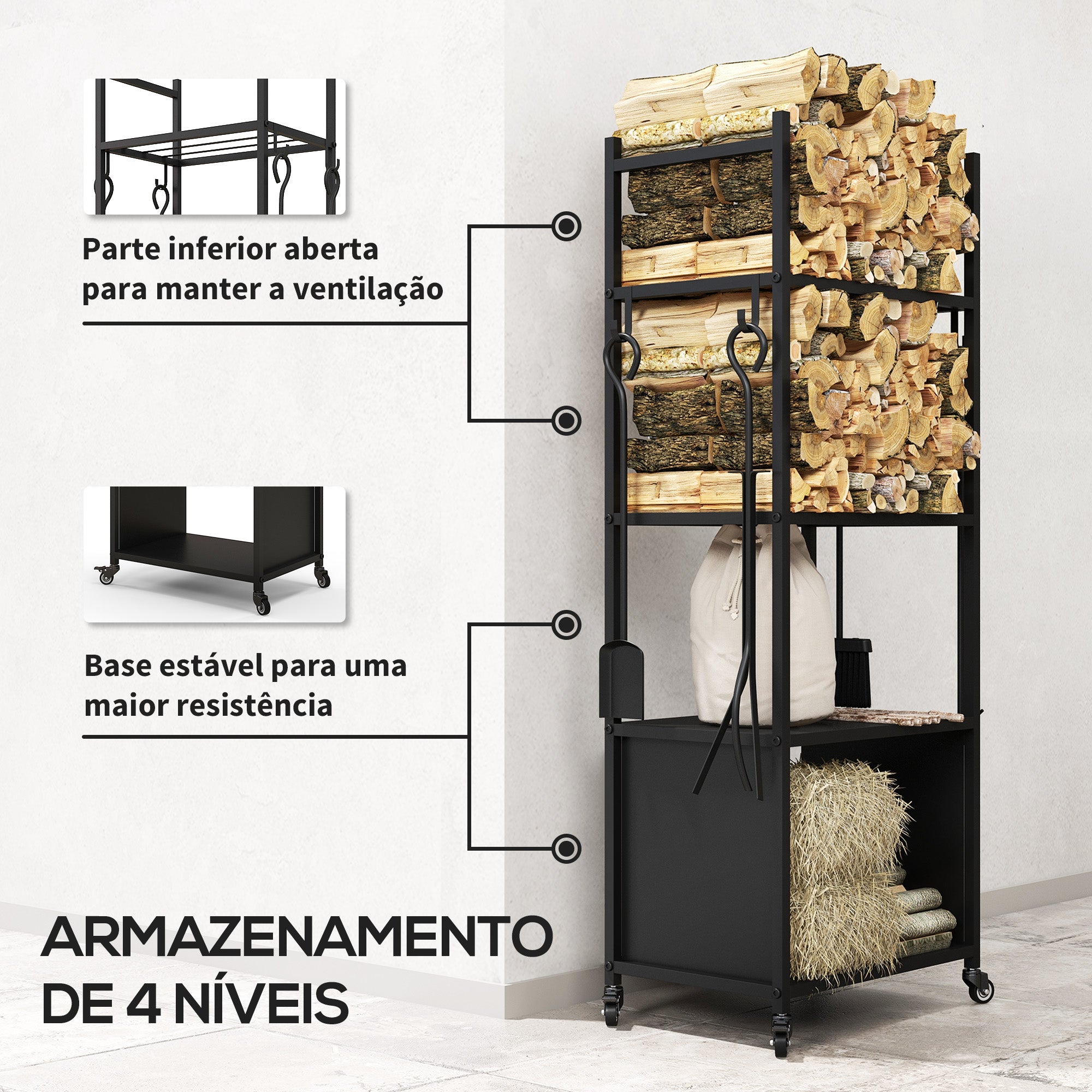 Suporte para Lenha com Rodas Suporte para Lenha de 4 Níveis Estante para Lenha com Pá Escova Atiçador e Tenaz para Interior e Exterior 45x30x118 cm Preto