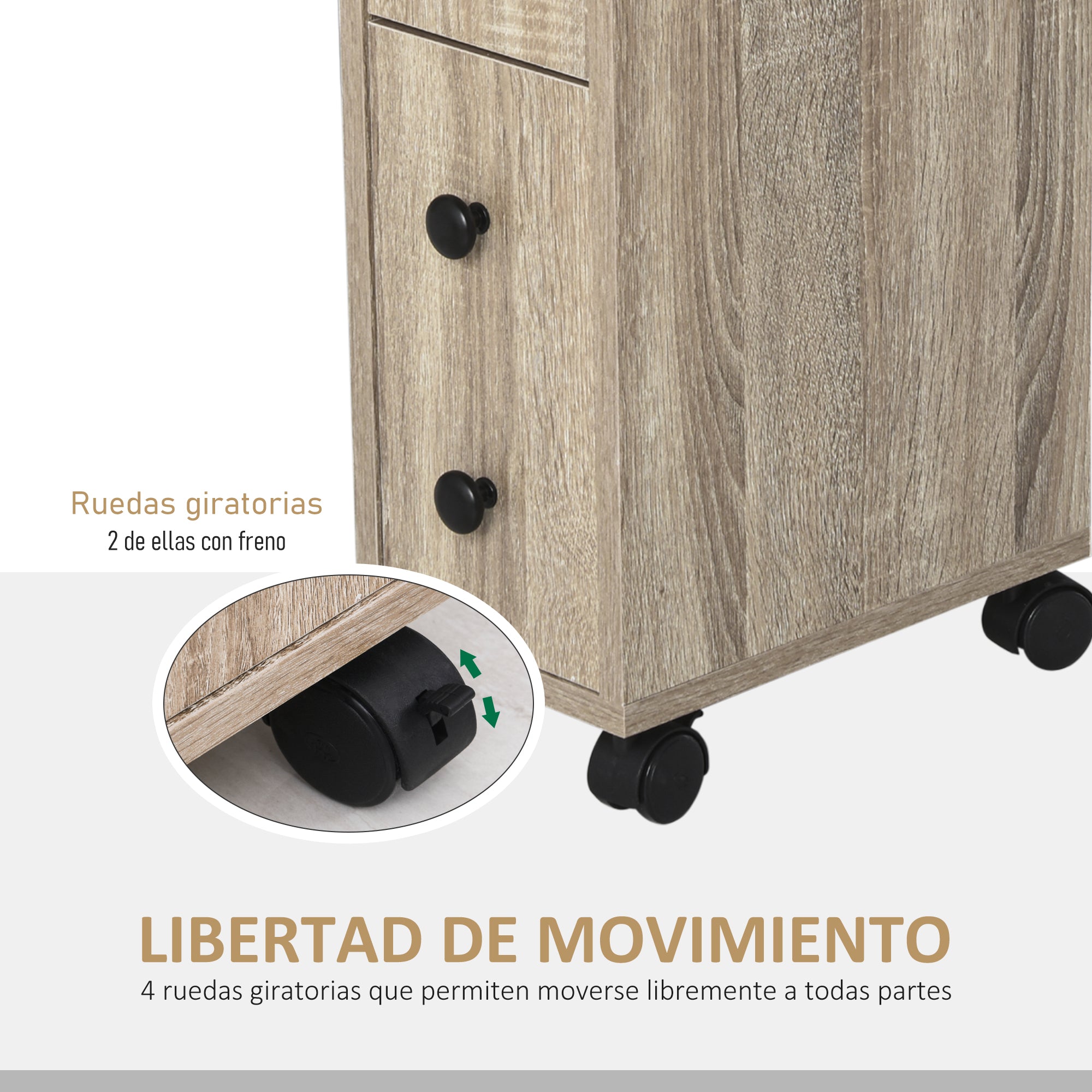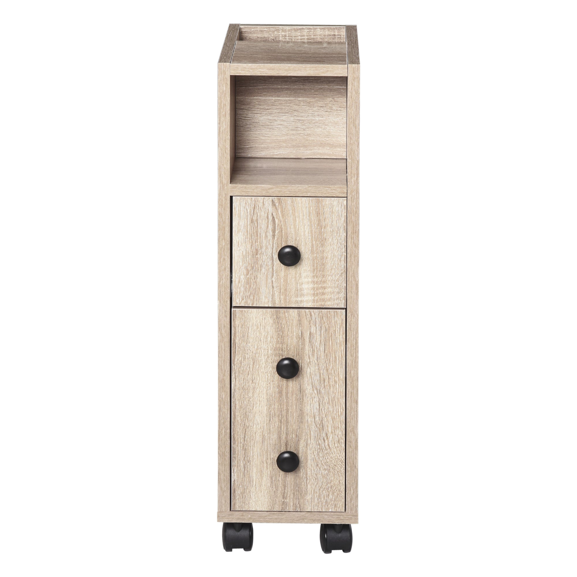 - PROJETO LEVE E COMPACTO: O design compacto deste gabinete lateral é ideal para banheiros e outros espaços pequenos. A cor do grão de carvalho com detalhes em preto (alças e rodas) vai combinar perfeitamente com o estilo da sua casa.