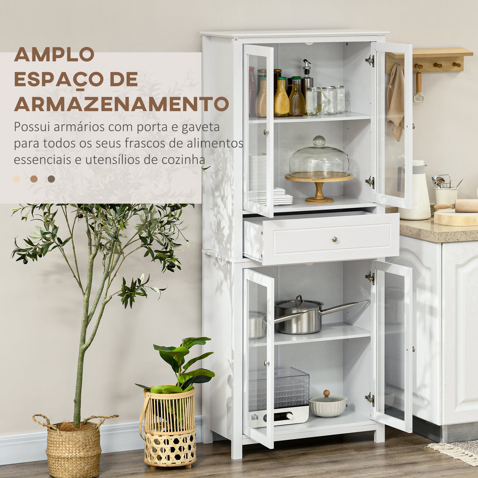 - 4 PRATELEIRAS: Este armário alto oferece amplo espaço para armazenar e organizar diferentes tipos de itens. As 4 prateleiras são ideais para pratos, copos, comidas, livros, objetos decorativos, entre outros. Possui prateleiras ajustáveis em altura para atender às suas diferentes necessidades e ter portas manterá seus objetos longe da poeira