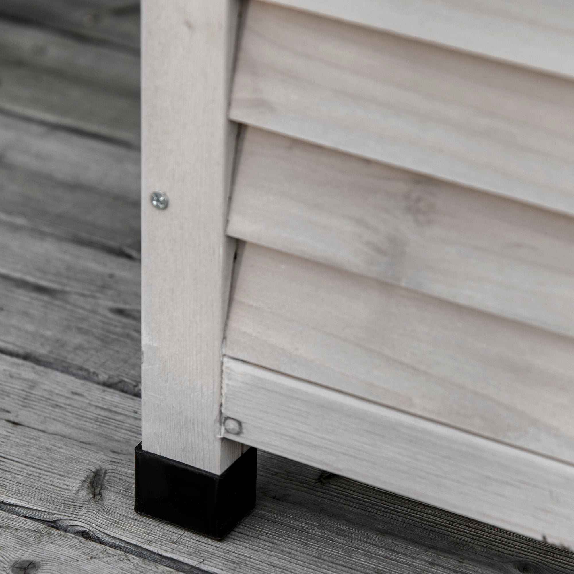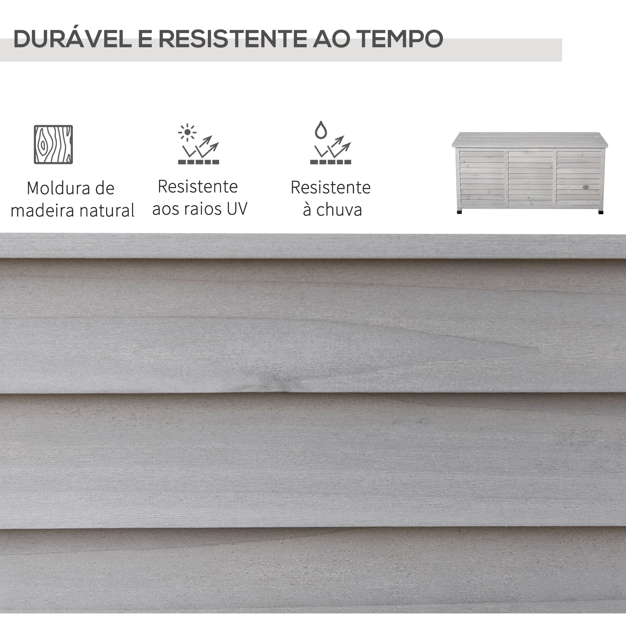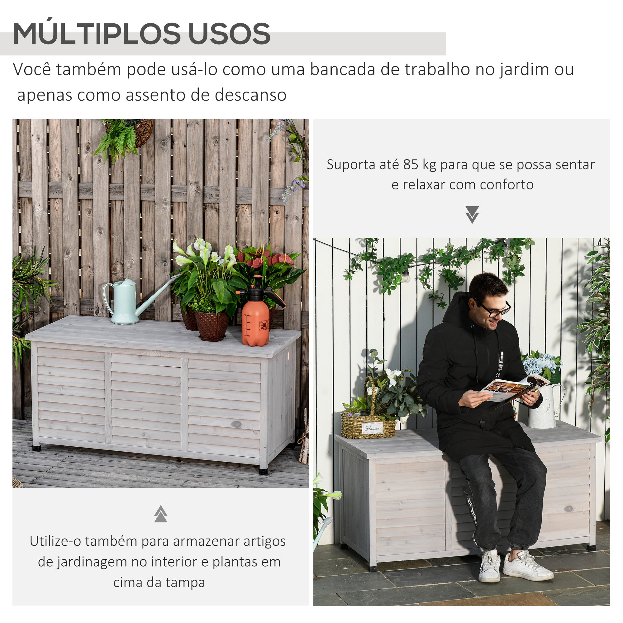 - 1 x Manual de instruções Esta arca de arrumação exterior da Outsunny é a solução ideal para ter no seu jardim. Amplo espaço para guardar ferramentas de jardim, brinquedos ao ar livre, etc. Fabricado em madeira maciça de abeto tratada para resistir às intempéries e com protetores nas pernas para evitar o contacto da madeira com o solo. Pode ser usado como baú de armazenamento e também para sentar. Seu desenho de persiana oferece boa ventilação interna. Funcional e bonito!