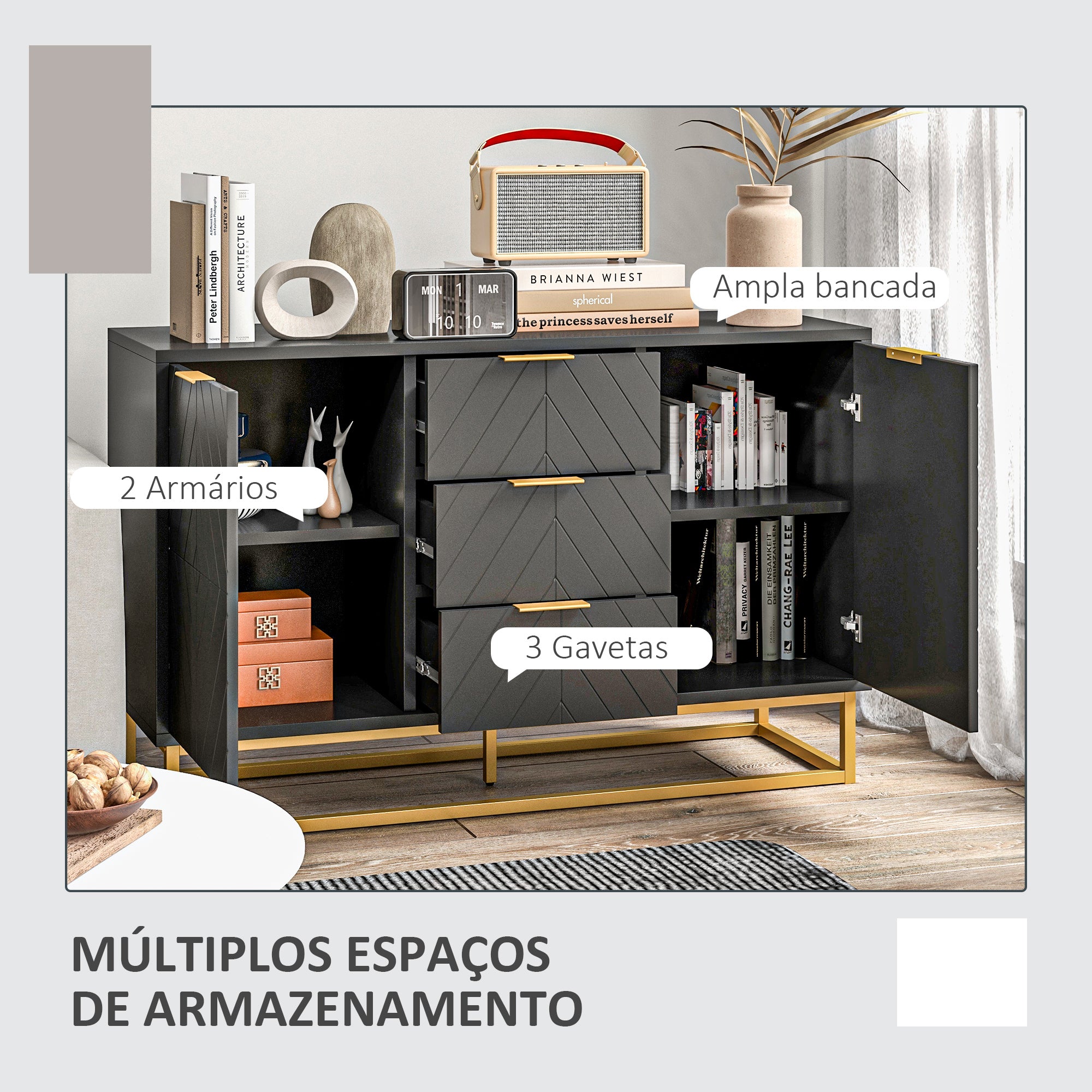 - ESPAÇOSO E FUNCIONAL: Este aparador multifuncional dispõe de três gavetas perfeitas para armazenar acessórios pequenos e duas portas que oferecem um amplo espaço para pratos, frigideiras e outros utensílios do dia a dia