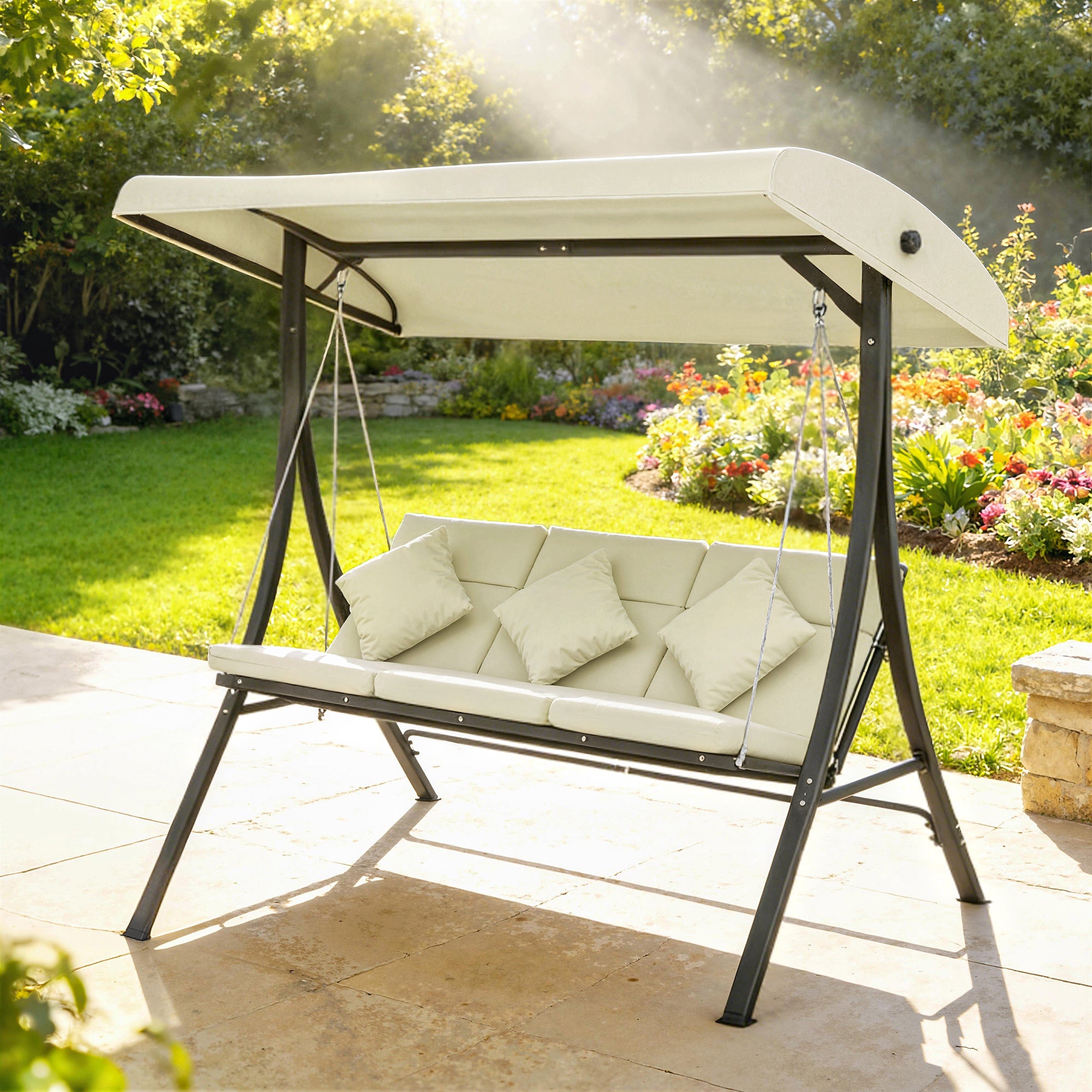 Baloiço de Jardim Exterior de 3 Lugares Baloiço com Toldo Ajustável Almofadas e Estrutura de Aço para Terraço ou Jardim Suporta até 320 kg 202x115x168 cm Bege