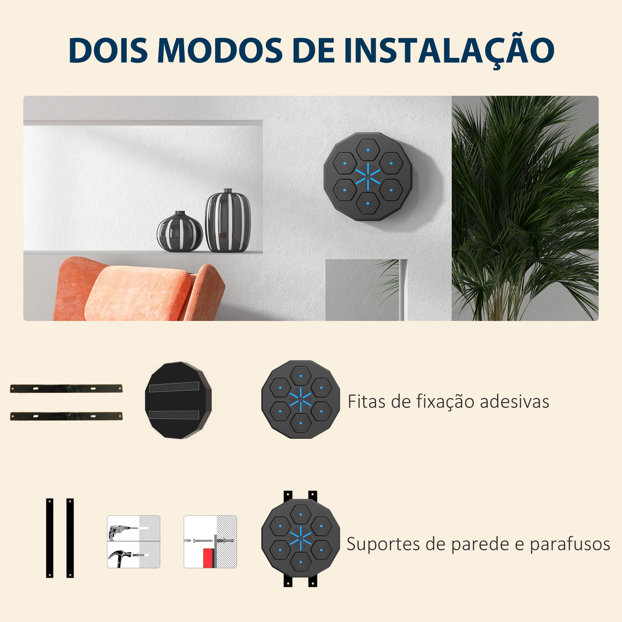 • COMPACTA E PRONTA A USAR: Com medidas de 40x40x7,5 cm (CxLxA), esta máquina de boxe é usada diretamente sem necessidade de montagem. Ideal para treinar em casa, escritórios dinâmicos ou ginásios pessoais O pacote inclui: ? 1 x Máquina de boxe com música; ? 1 x Cabo de carregamento Tipo·C; ? 1 x Conjunto de acessórios de montagem; ? 1 x Manual de instruções Tira o melhor de si com esta máquina de boxe musical da SPORTNOW. Com conexão Bluetooth e luzes que marcam o ritmo, oferece treinos intensos e divertidos. O seu acolchoado em espuma com revestimento de PU proporciona conforto, e podes instalá·la facilmente em qualquer parede. O boxe de parede musical é ideal para treinar, libertar stress ou melhorar reflexos em casa ou em espaços de trabalho ativos