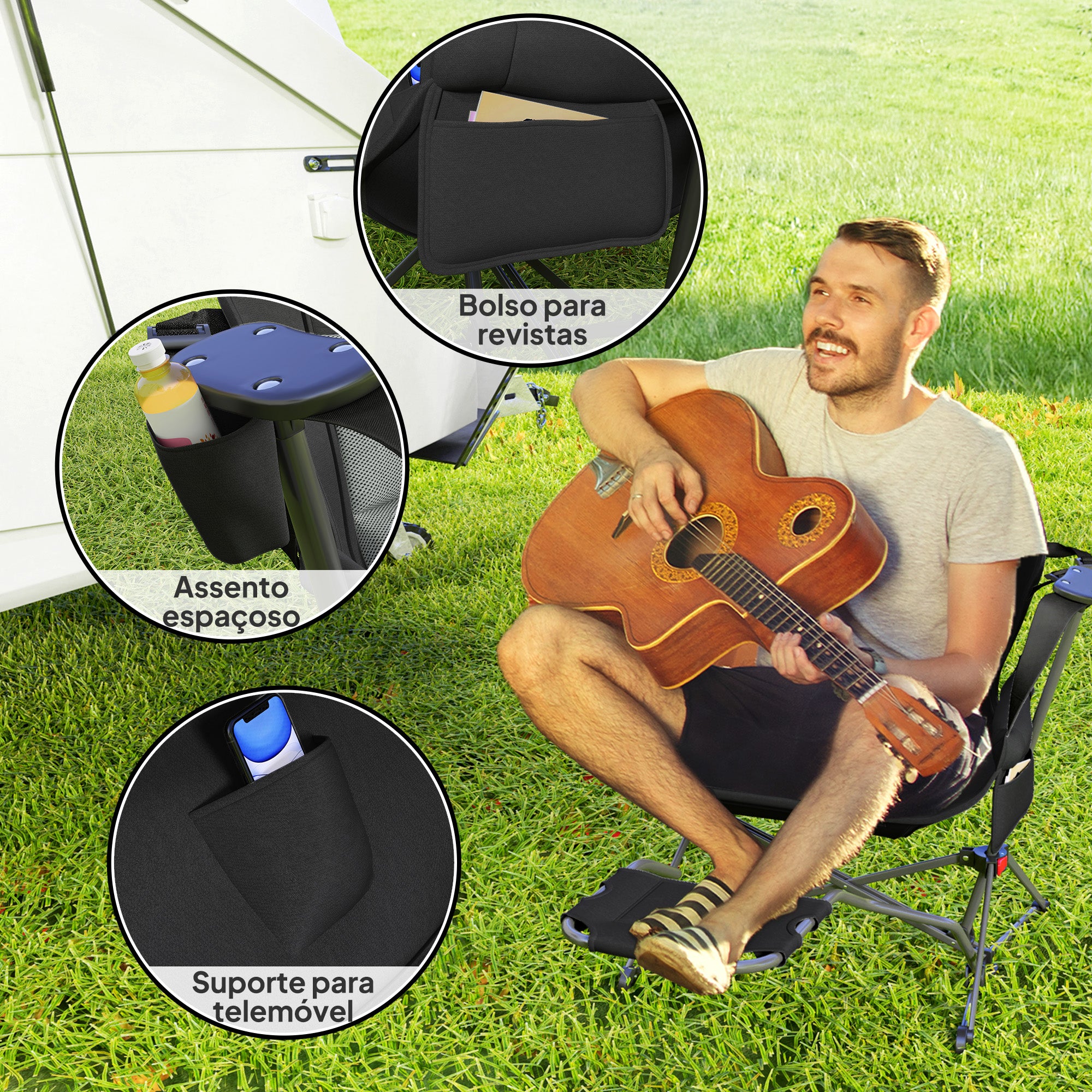 • Desenho compacto e dobrável para fácil transporte, inclui saco de transporte Inclui uma bolsa para revistas, um suporte para copos e um suporte para telemóvel para maior comodidade Tecido Oxford 400D com resistência aos raios UV e à água para maior durabilidade Maior estabilidade graças à estrutura metálica de suporte em triângulo cruzado