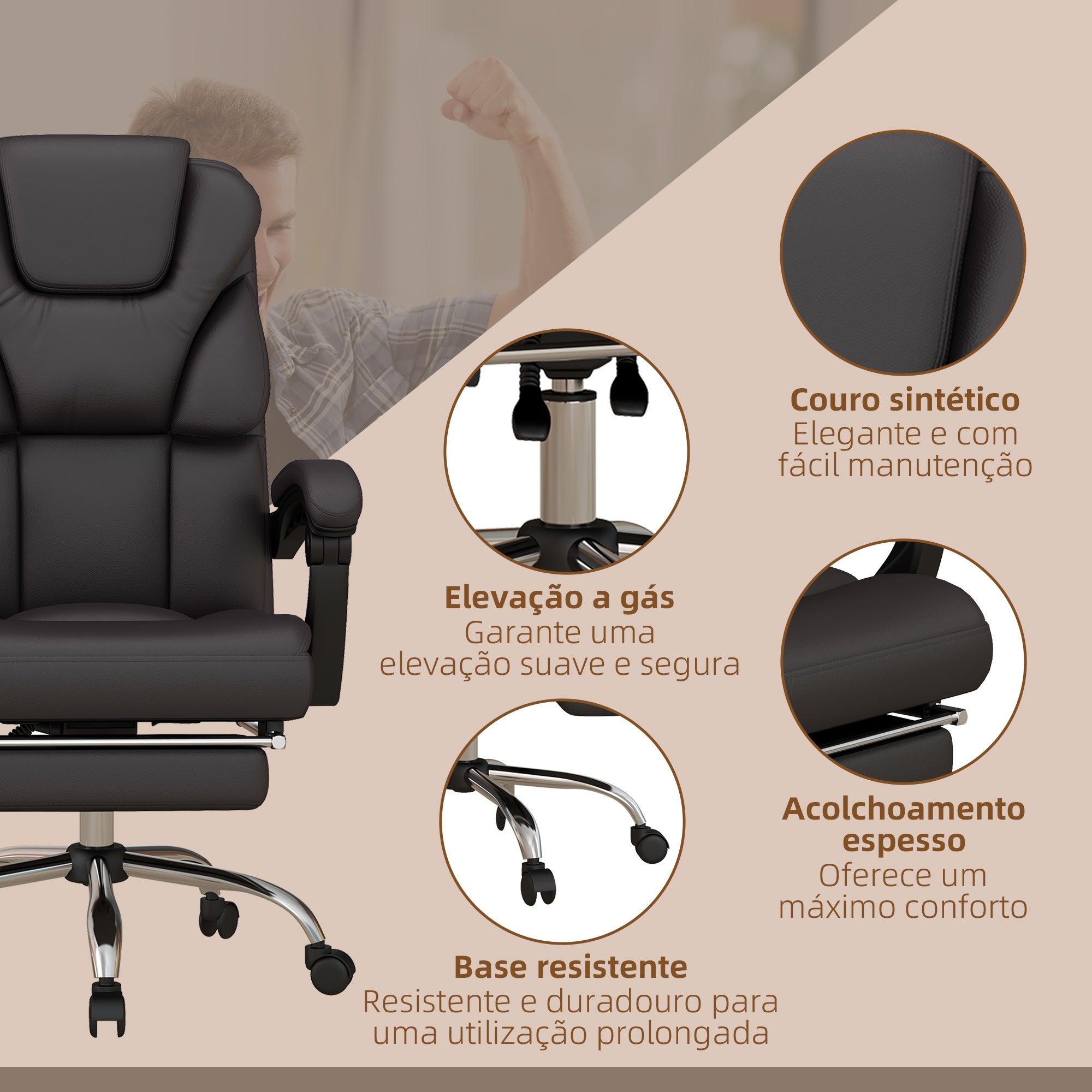 Cadeira de Escritório com 6 Pontos de Massagem Cadeira Executiva Reclinável de PU com Controlo Remoto Altura Ajustável Encosto Alto Apoio para os Pés e Bolso 63x57x118-126 cm Marrom