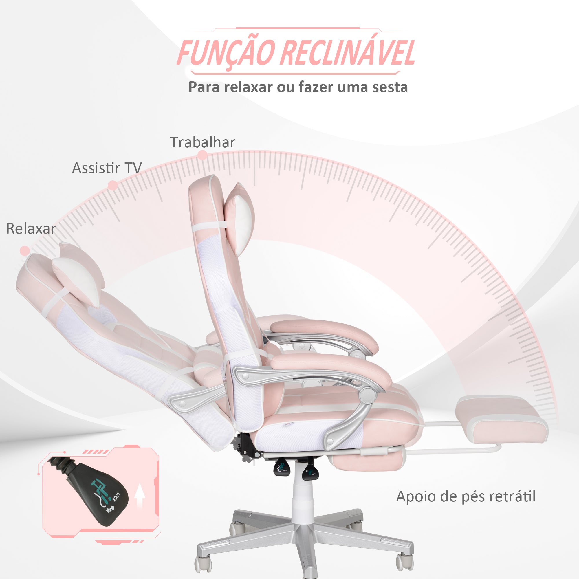 - Cadeira de escritório estilo gaming estofada em elegante couro sintético nas cores rosa e branco Encosto reclinável até 150° para encontrar a posição ideal Apoio para os pés para um conforto máximo Altura ajustável entre 48 e 55,5 cm Inclui almofada para a cabeça e suporte lombar As cinco rodas giratórias garantem movimentação livre e fácil Requer montagem