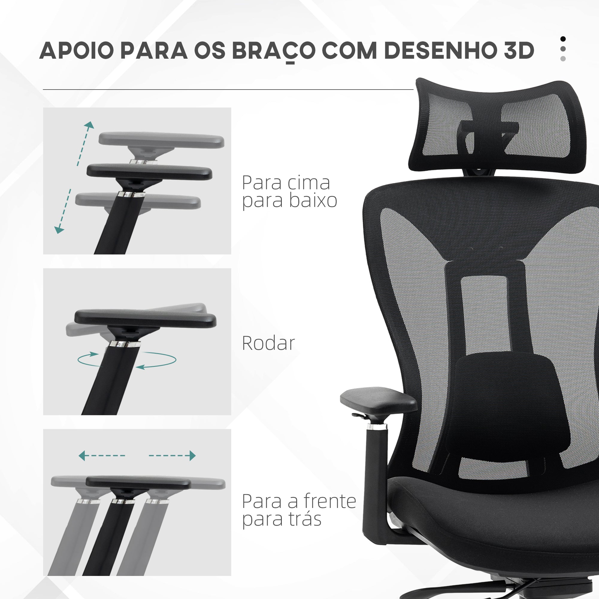 - Faça uma pausa e alongue·se com função de reclinação de até 135° Altura do assento ajustável para adequar·se ao seu estilo de sentar O apoio lombar alivia a pressão na área lombar O encosto de cabeça pode ser movido para cima ou para baixo, girado e é removível.? Apoio para os braços ajustável para cima ou para baixo, para frente ou para trás e também pode·se girar Tecido em malha respirável e macio Rodas giratórias e assento garantem mobilidade fácil e rápida Requer montagem