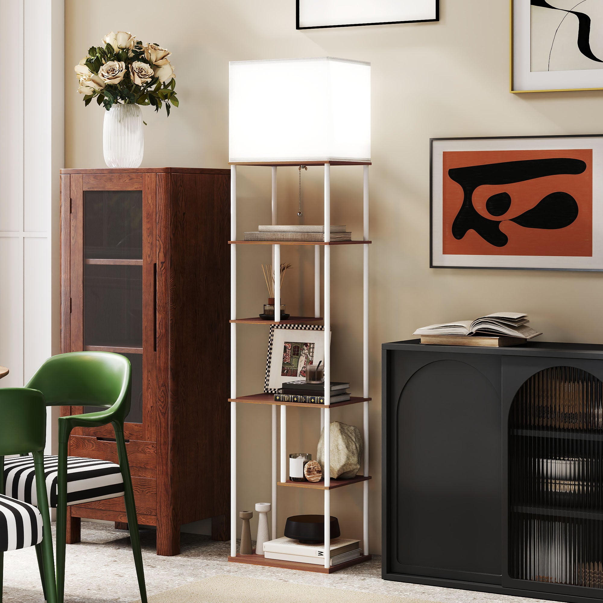 - PRATELEIRAS ASSIMÉTRICAS MULTIFUNCIONAIS: Este candeeiro de pé para sala com prateleiras inclui cinco níveis escalonados. Uma solução funcional que combina iluminação e organização em qualquer canto
