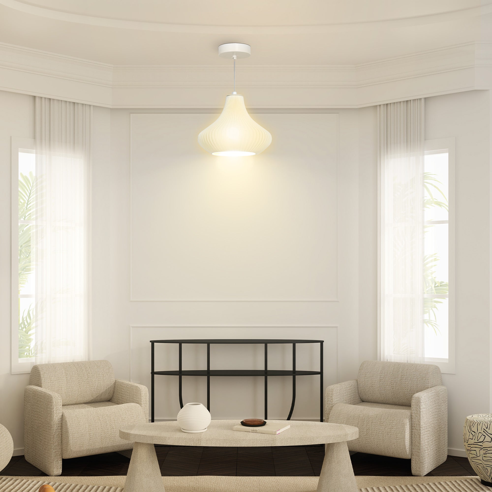 - MATERIAIS RESISTENTES: Este candeeiro suspenso conta com uma estrutura robusta, com placa de montagem metálica e ecrã em ABS, garantindo estabilidade e resistência para um uso prolongado. Perfeito para qualquer espaço que necessite de uma iluminação fiável