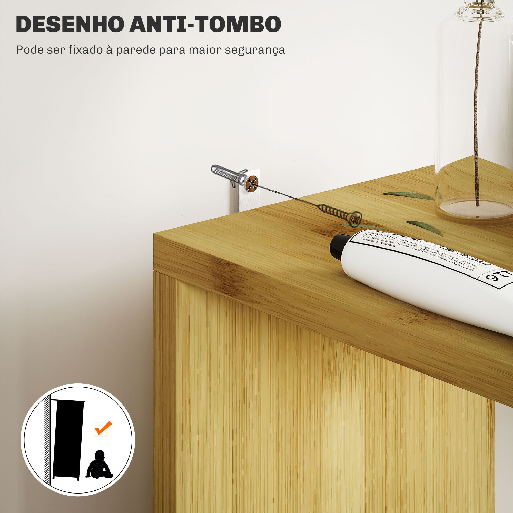 • Coluna de casa de banho estreita ideal para aproveitar ao máximo qualquer canto da sua casa de banho Possui 2 prateleiras abertas e 2 armários, oferecendo um amplo espaço de arrumação O desenho alto e estreito permite poupar espaço e adapta·se perfeitamente a espaços pequenos Estrutura resistente e estável feita de bambu, melamina e MDF, ideal para uma utilização a longo prazo Portas magnéticas com puxadores ocos para facilitar o acesso Com sistema anti·tombo para fixar à parede para maior segurança e estabilidade A base elevada evita danos causados pela humidade Necessita de montagem