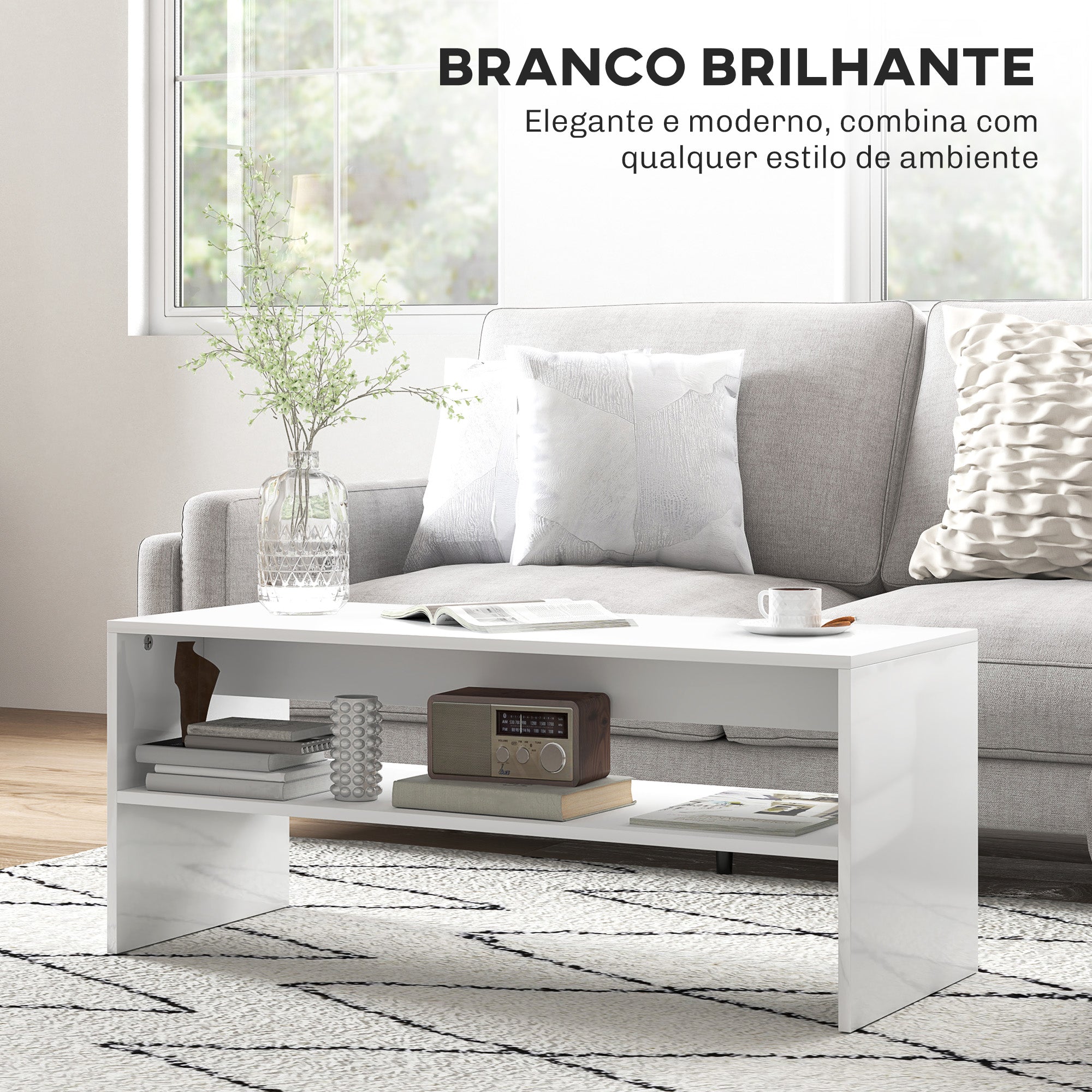 - Mesa de centro para sala de estar com acabamento de alto brilho, que adiciona um toque elegante a qualquer ambiente A ampla superfície e a prateleira aberta oferecem um excelente espaço de arrumação Fabricada em melamina de madeira resistente, ideal para utilização prolongada As almofadas nas pernas protegem o chão contra riscos e danos Montagem simples e rápida