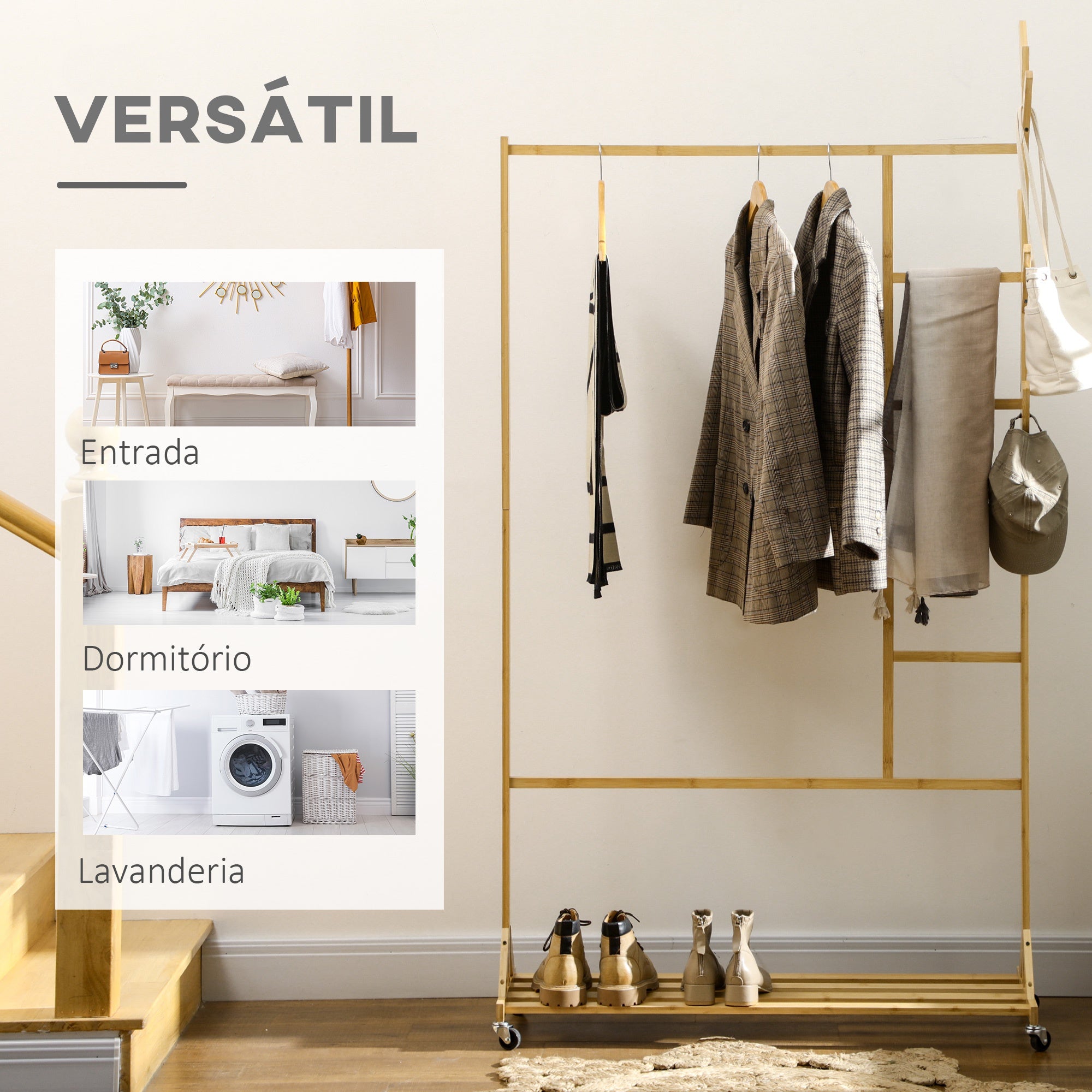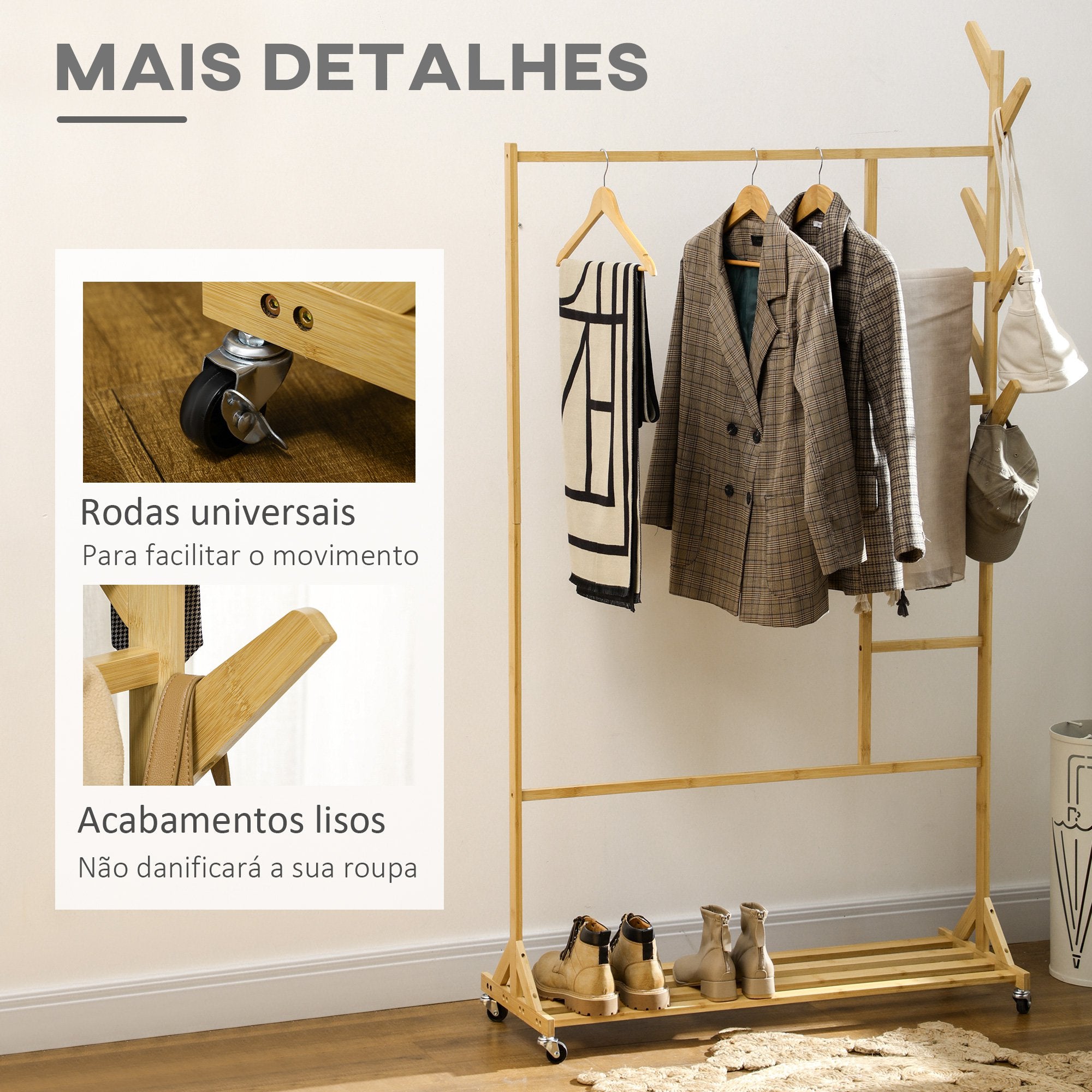 Suporte para Cabides de Bambu com Rodas Porta Cabides Multifuncional com 6 Ganchos Barra e Prateleira para Corredor Entrada Dormitório 100x37x191 cm Madeira