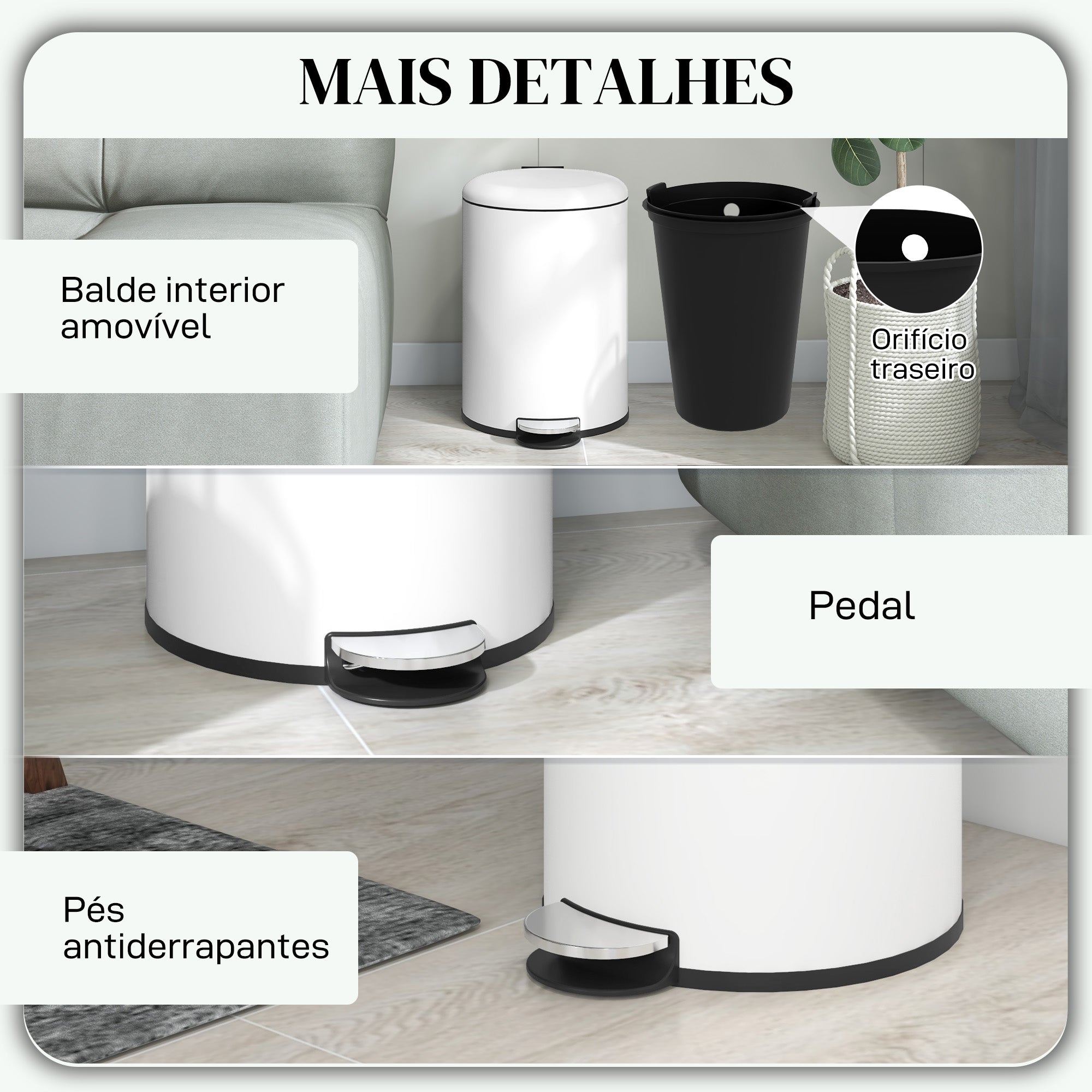 • FECHAMENTO SUAVE: Equipado com um pedal para uma abertura silenciosa, este balde de lixo também fecha suavemente, evitando assim ruídos indesejáveis