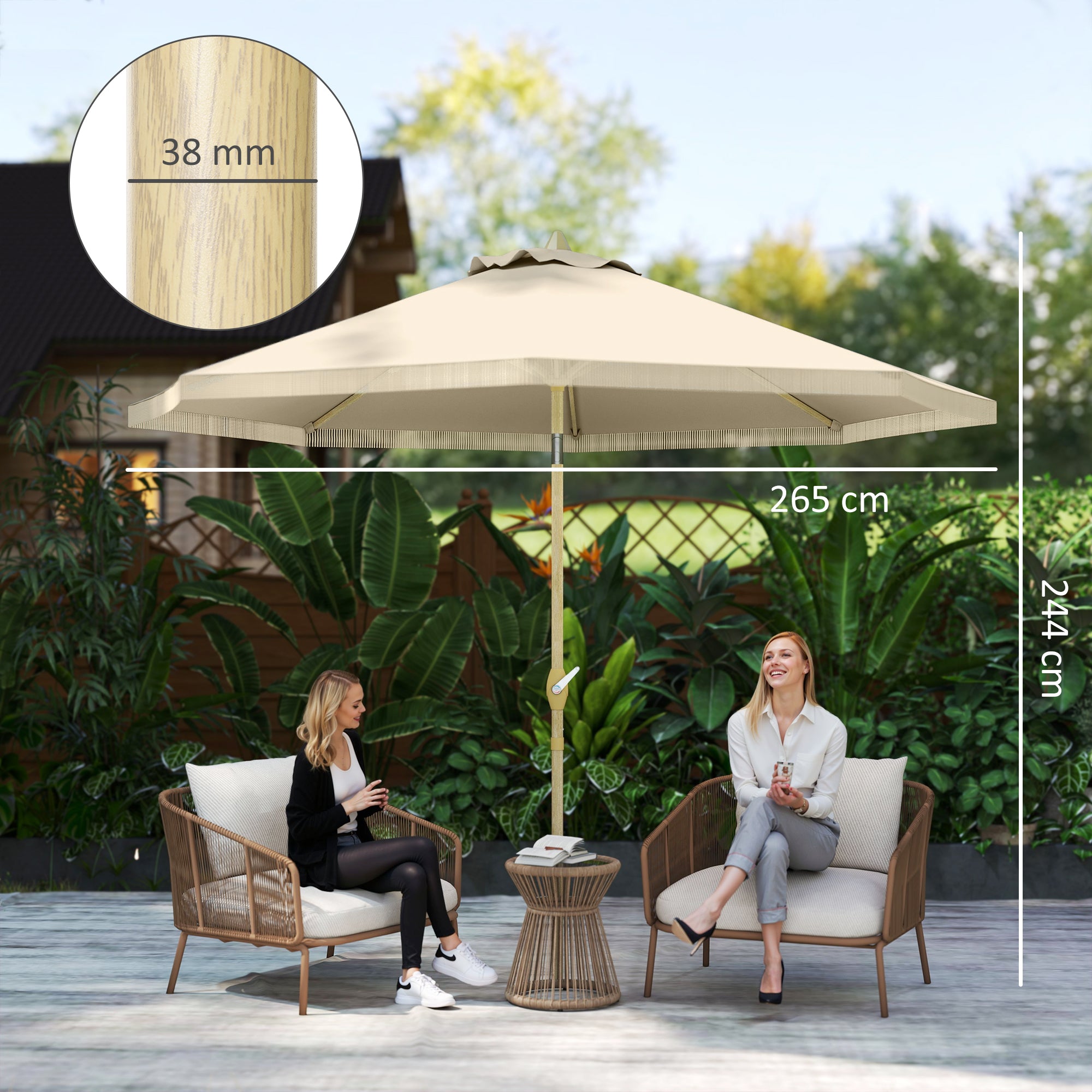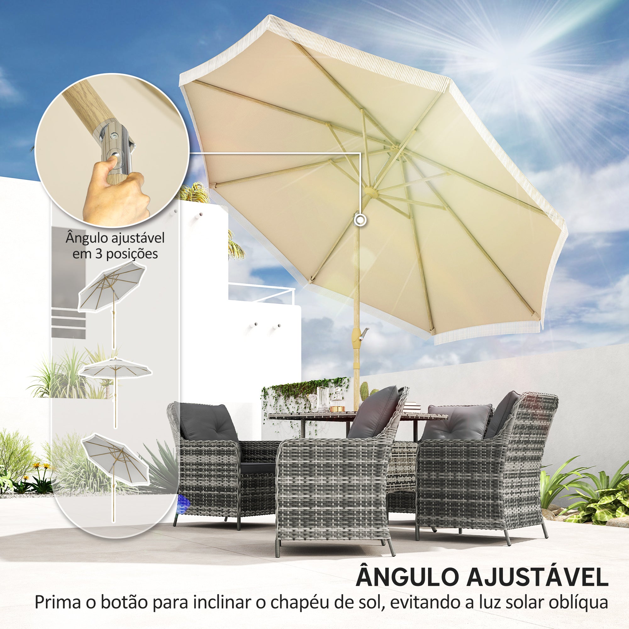 Chapéu de Sol Exterior Ø265x244 cm Chapéu de Sol de Jardim com Ângulo Ajustável Manivela Franjas de Estilo Boho Impermeável Chapéu de Sol para Pátio Terraço Creme