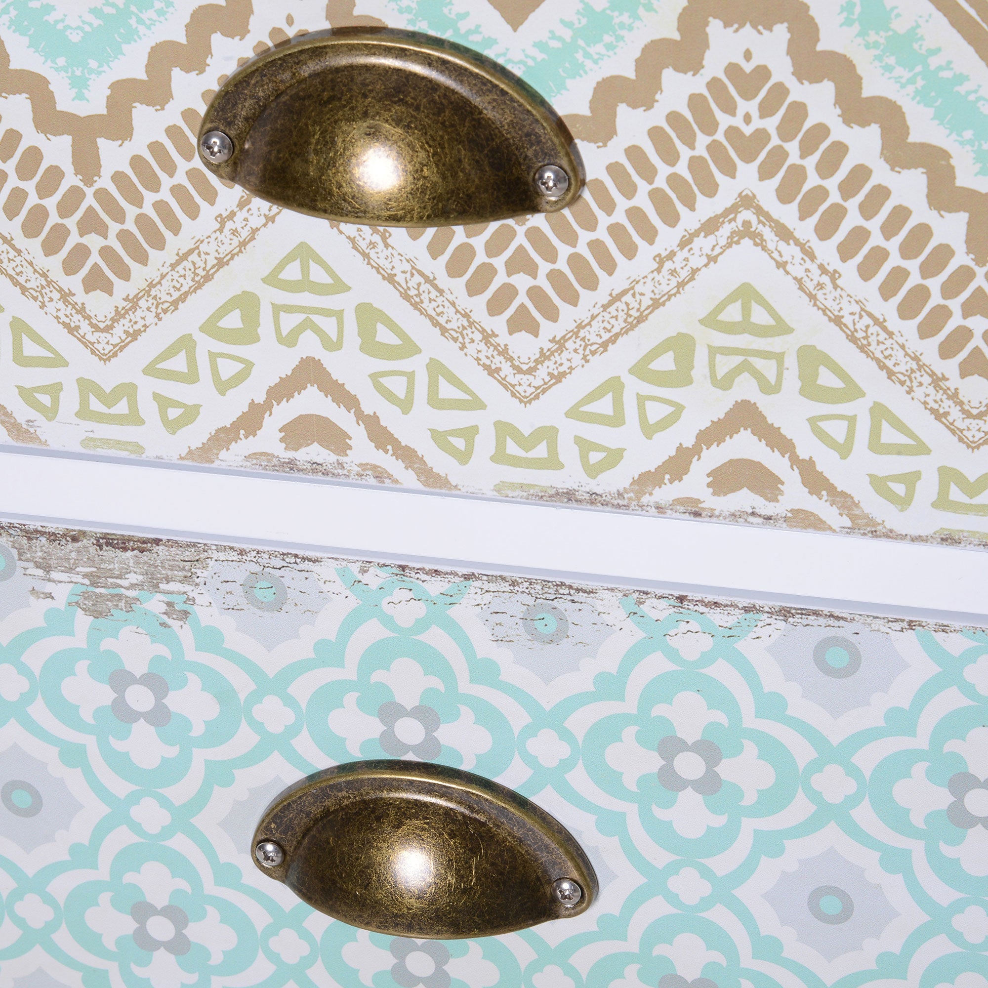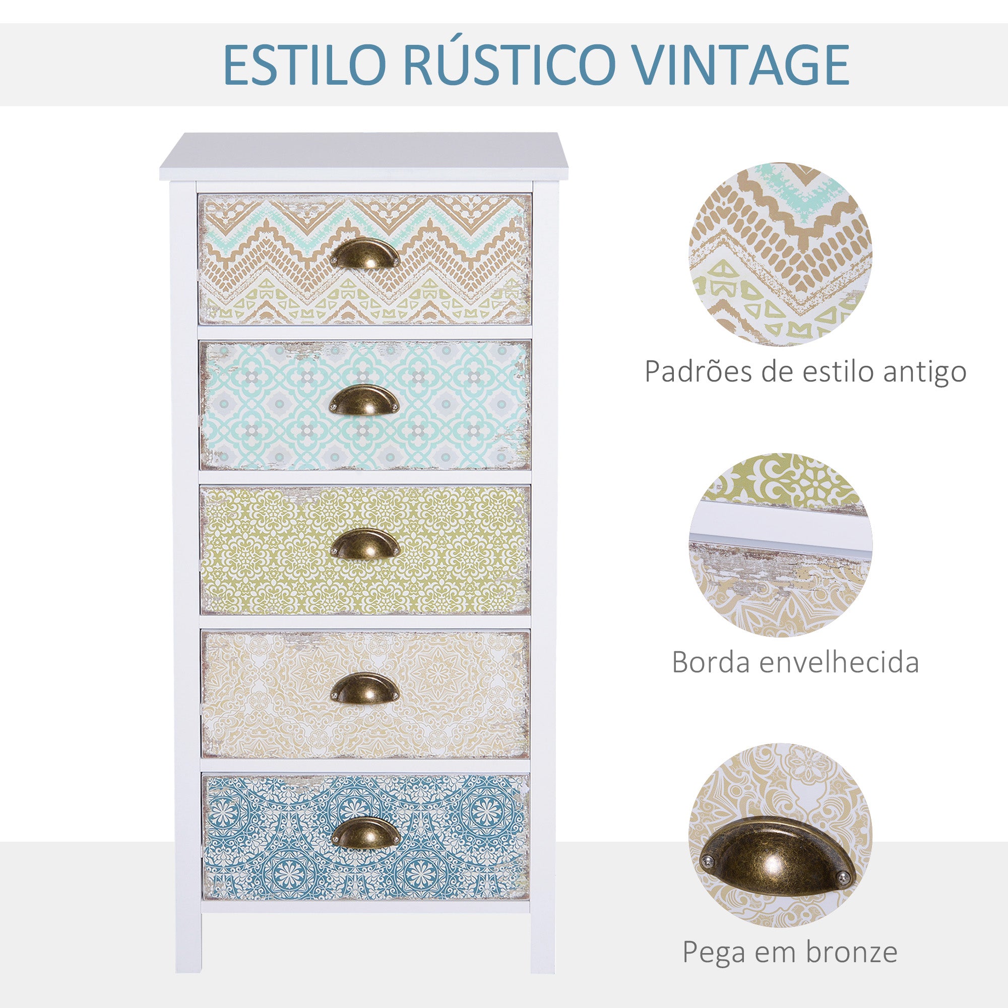 - ESTILO VINTAGE: As cinco gavetas desta cómoda de quarto são coloridas e cobertas com diferentes padrões. Além disso, os rebordos das gavetas em estilo rústico vintage conferem a esta cómoda um aspeto antigo e desgastado