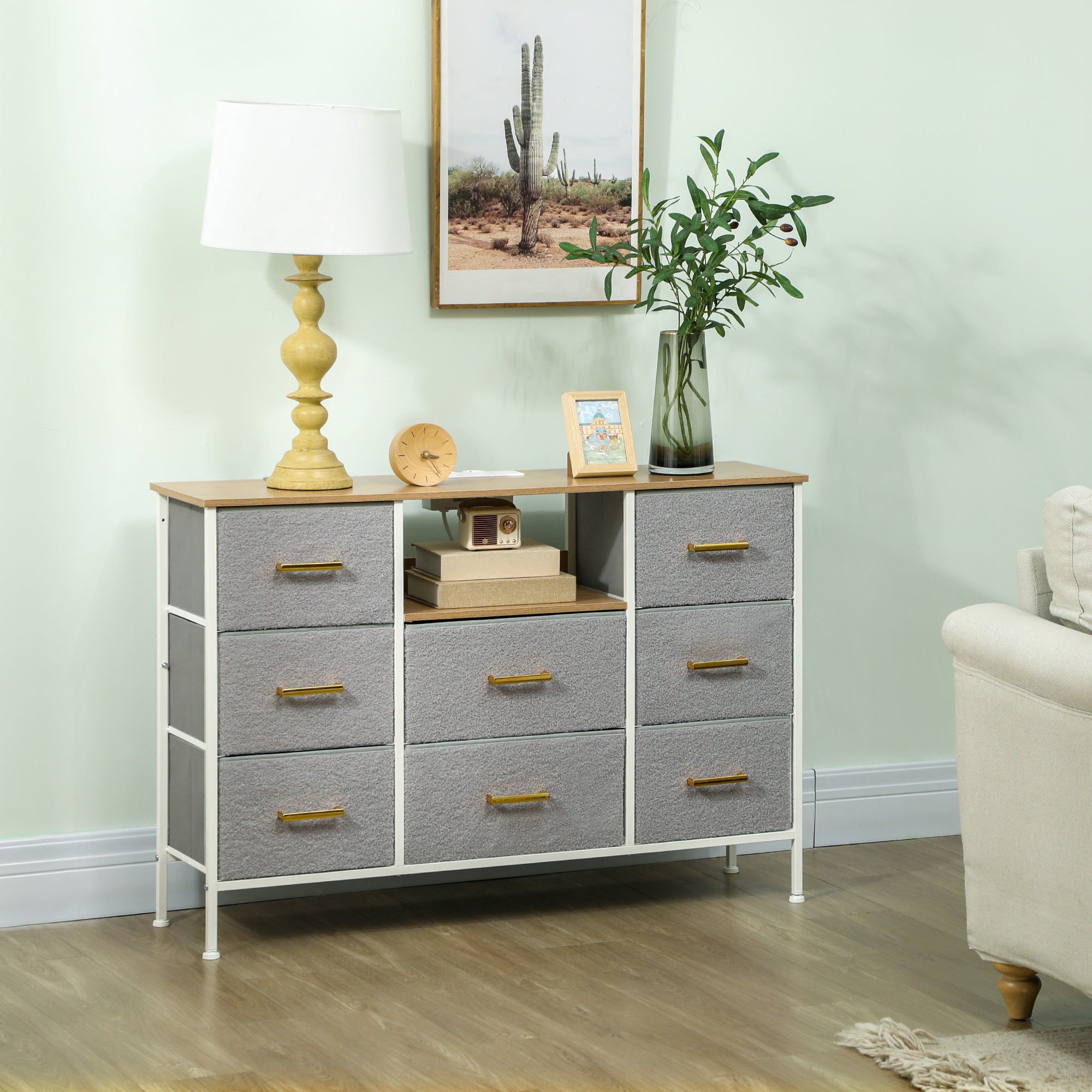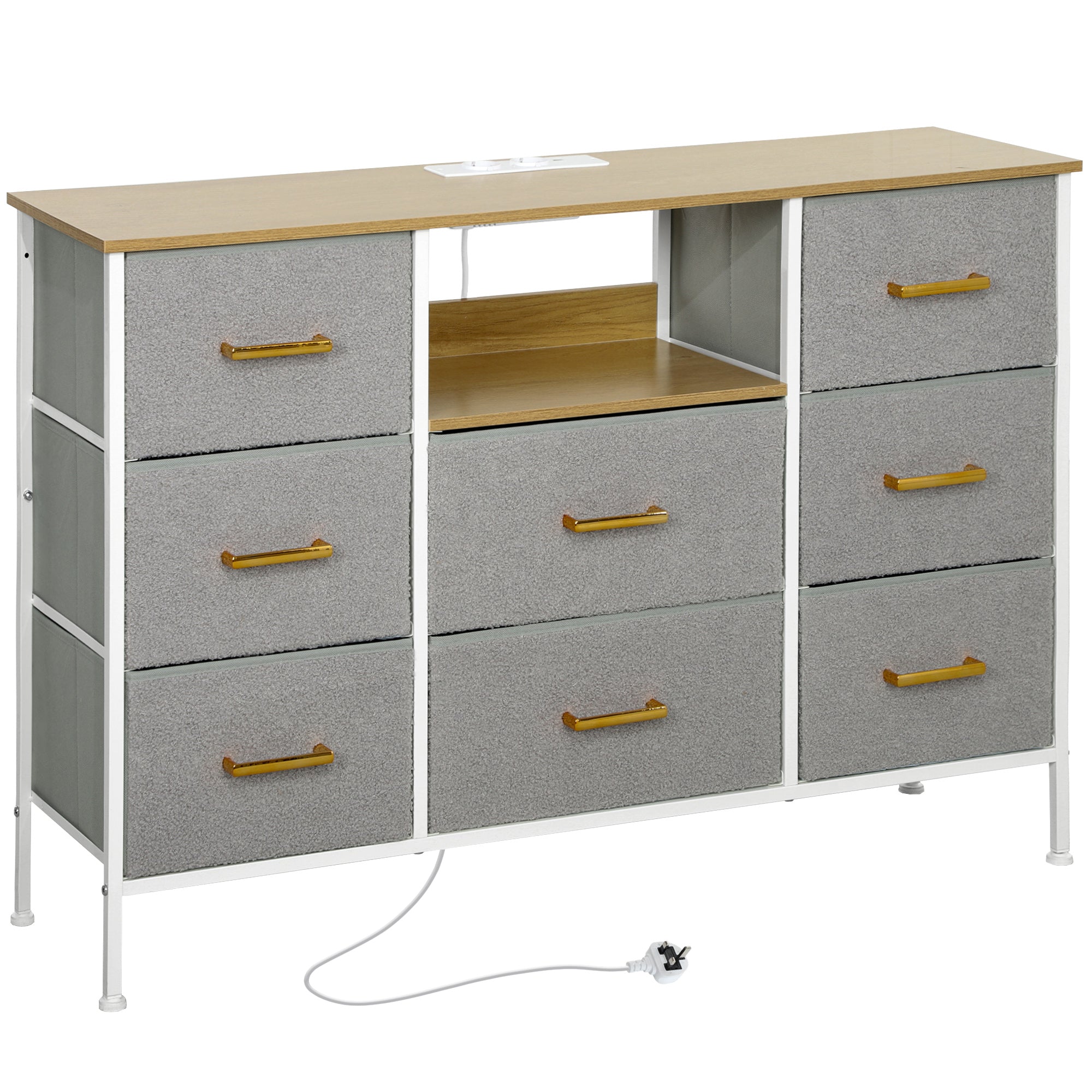 Cómoda com 8 Gavetas Estofada em Borreguito Cómoda de Tela com Estação de Carga Porta USB Tipo-C e Estrutura de Aço Cómoda para Dormitório Corredor 110x30x76 cm Cinzento