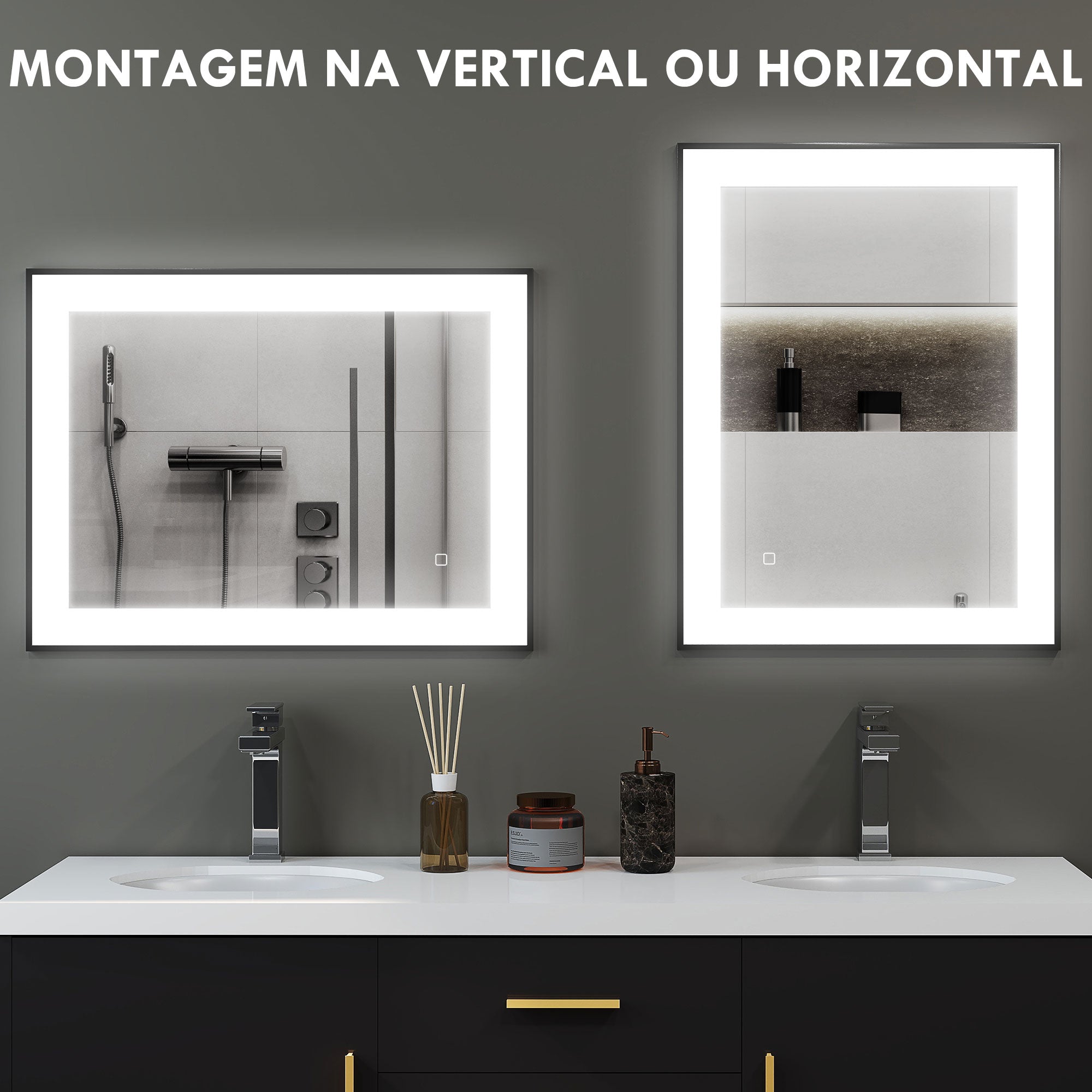 Espelho Casa de Banho com Luz LED 80x60 cm Espelho de Parede com Iluminação Ajustável Função Anti-Embaciamento Função Memória e Estrutura de Liga de Alumínio Preto