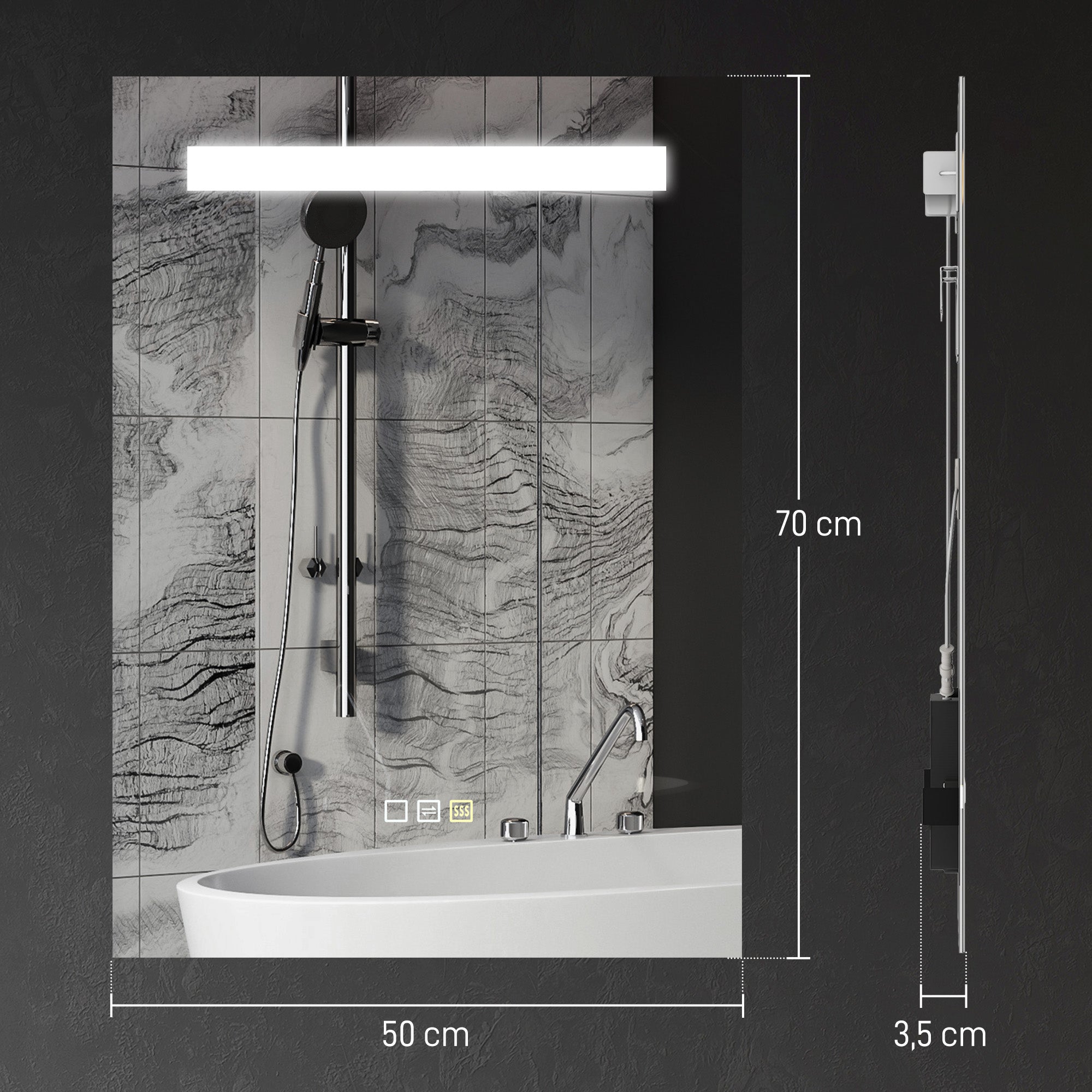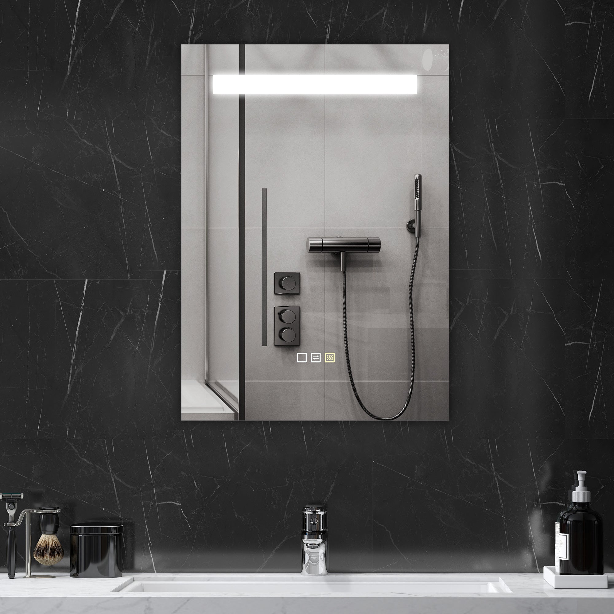 - ESPELHO SEGURO E REFLEXÃO HD: O vidro temperado resiste a impactos e oferece uma imagem nítida, sem distorções. Pode ser acionado por um interruptor de parede ou pelo toque e inclui um cabo para ligação direta O pacote inclui: