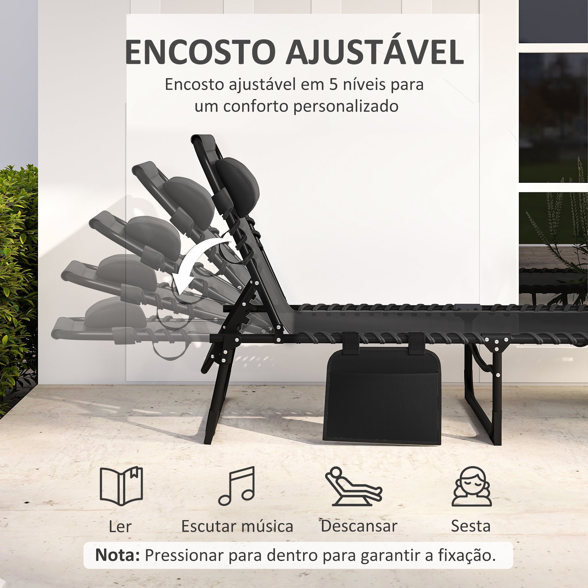 - Esta espreguiçadeira reclinável possui um encosto ajustável em 5 posições, com sistema de bloqueio Tem um design dobrável que facilita o transporte e o armazenamento compacto Esta espreguiçadeira inclui uma almofada para apoio do pescoço, que também pode ser usada como suporte lombar Inclui um prático bolso lateral para guardar revistas, livros e dispositivos A sua estrutura robusta de aço com revestimento em pó suporta até 120 kg Está equipada com um tecido textilene resistente às intempéries, garantindo alta respirabilidade A espreguiçadeira de jardim exterior requer montagem