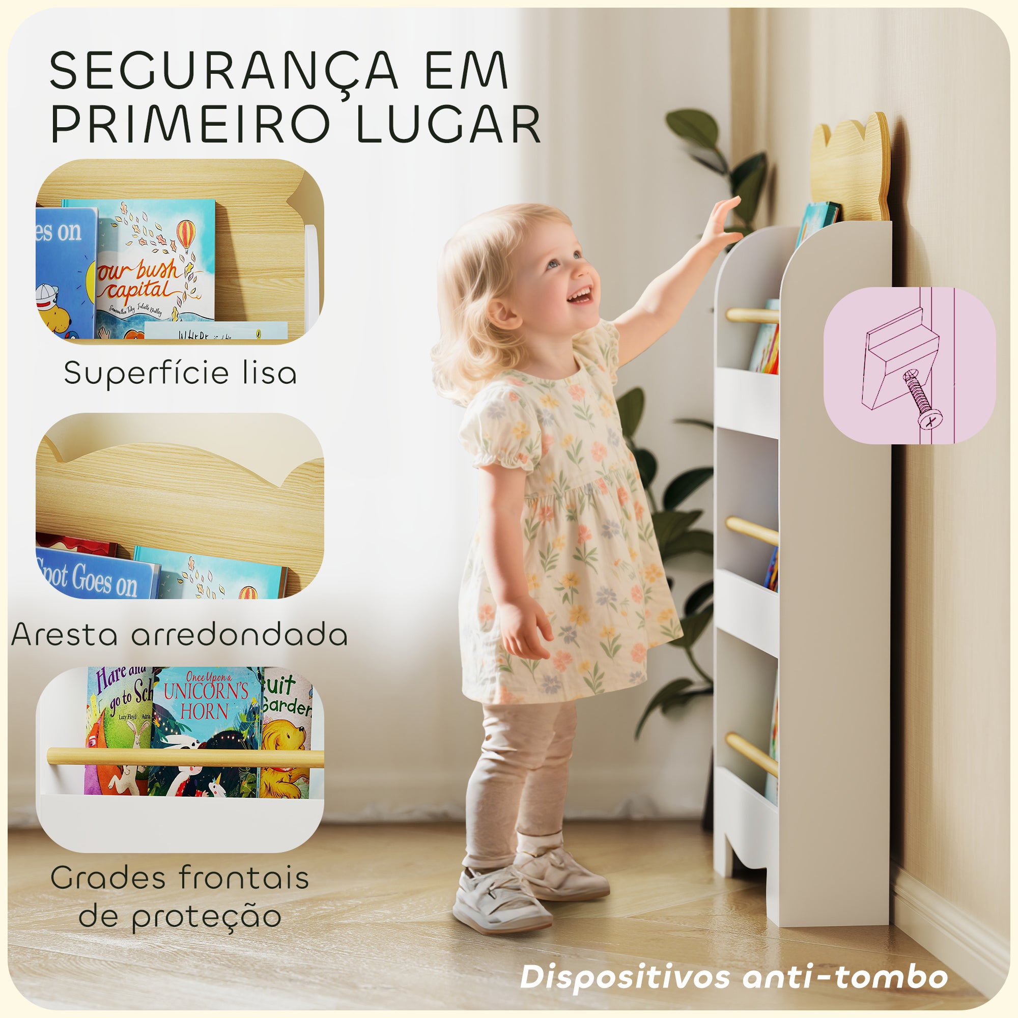 - SEGURANÇA EM PRIMEIRO LUGAR: Equipado com dispositivos anti·tombo, barreiras frontais e divisores, esta estante mantém os livros no seu lugar de forma segura. Os seus cantos arredondados protegem as crianças enquanto exploram a sua coleção