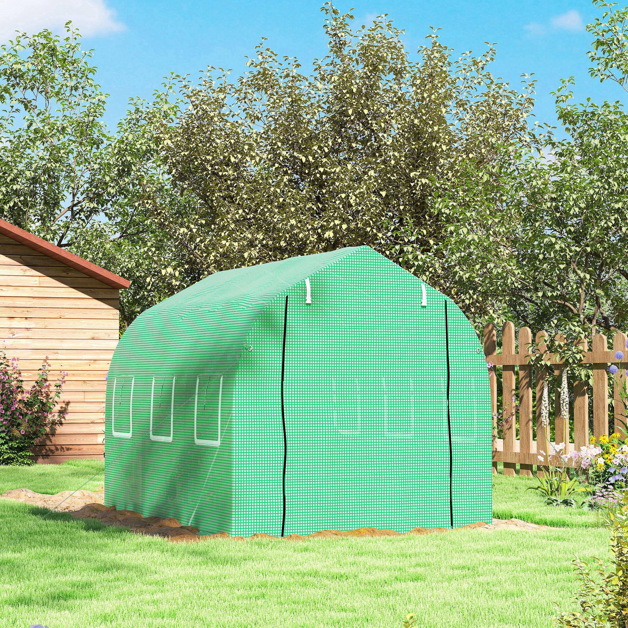 - Esta espaçosa estufa tipo túnel ajuda·o a criar o seu próprio jardim interior Ideal para o cultivo de legumes, ervas aromáticas e flores em qualquer estação do ano Tem 4 cordas e 4 estacas para a poder fixar firmemente ao solo para maior estabilidade A cobertura em tecido PE garante a proteção de todas as plantas contra o vento e a chuva leve A estrutura em aço galvanizado é resistente à corrosão, oferecendo estabilidade e durabilidade Possui portas de enrolar com fecho de correr para um acesso fácil e janelas de enrolar para uma ventilação ideal NOTA: Retirar a cobertura em caso de neve intensa, vento forte e chuva intensa