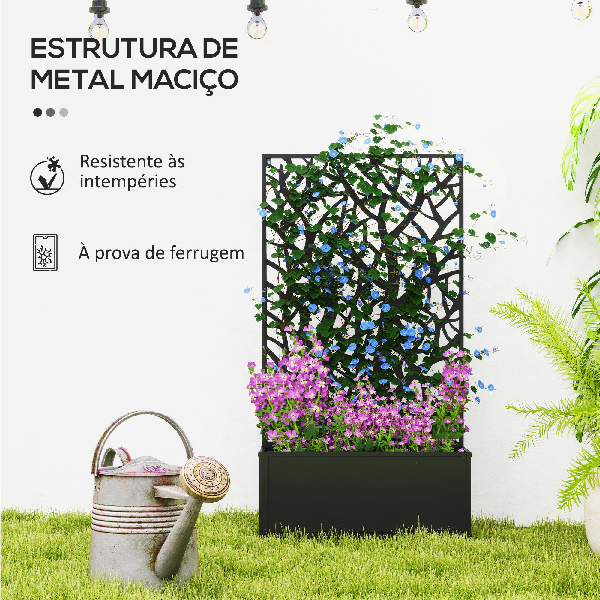 - Floreira com painel decorativo com recortes em forma ramos de uma árvore que funciona como treliça Grande área interna com capacidade para até 30 litros de terra Base com ranhuras de drenagem para evitar a acumulação de água O desenho versátil permite a montagem na parede ou a utilização independente Ideal para decorar com plantas trepadeiras ou flores, criando um espaço verde elegante Estrutura metálica revestida a pó resistente à ferrugem e às intempéries Montagem necessária