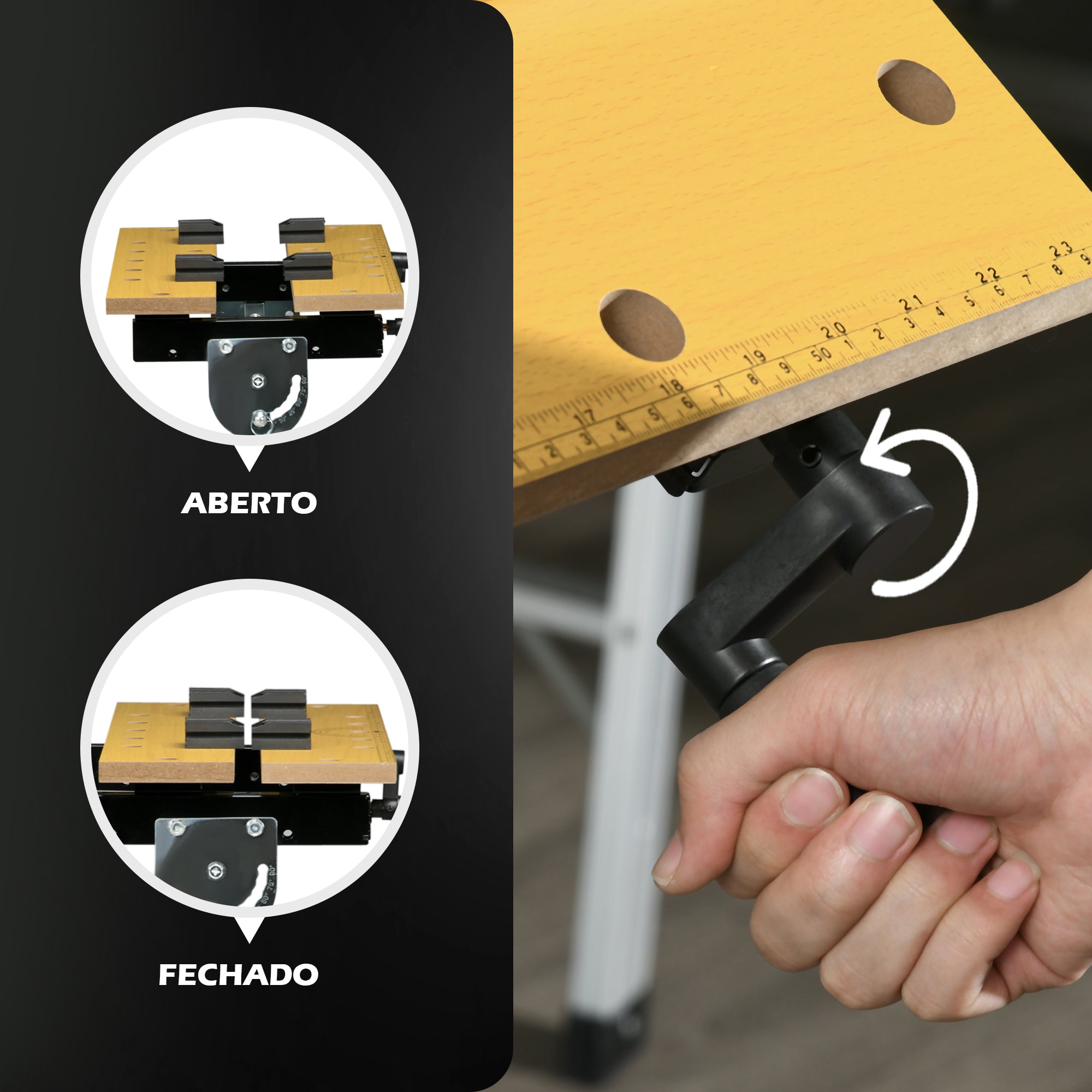 - 110 cm (CxLxA). Peso máximo suportado: 100 kg Esta bancada HOMCOM apresenta um design multifuncional que permite que seja usada como cavalete, grampo ou mesa de trabalho. Ideal para a sua garagem ou pequena oficina. Com estrutura metálica ajustável em altura e duas placas de MDF que são ajustadas por manivela em distância e ângulo. Uma das tabelas é impressa com régua e transferidor para poder fazer as medidas. E entre as pernas existem 2 barras com ranhuras para guardar as ferramentas.