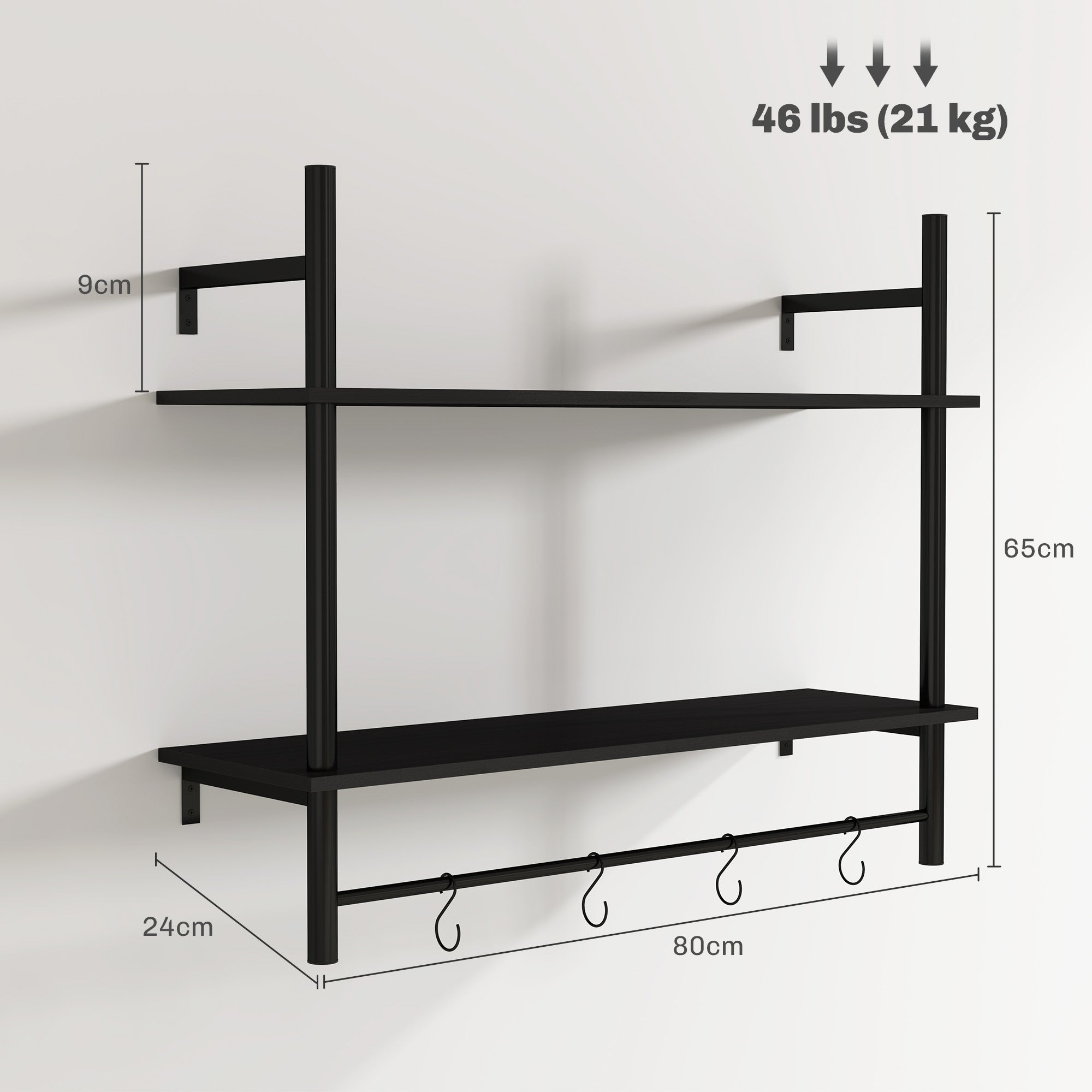 Estante de Parede de 2 Níveis Estante Suspensa Prateleiras de Parede com 4 Ganchos 2 Prateleiras e Estrutura de Metal para Entrada Cozinha Sala de Estar 80x24x65 cm Preto
