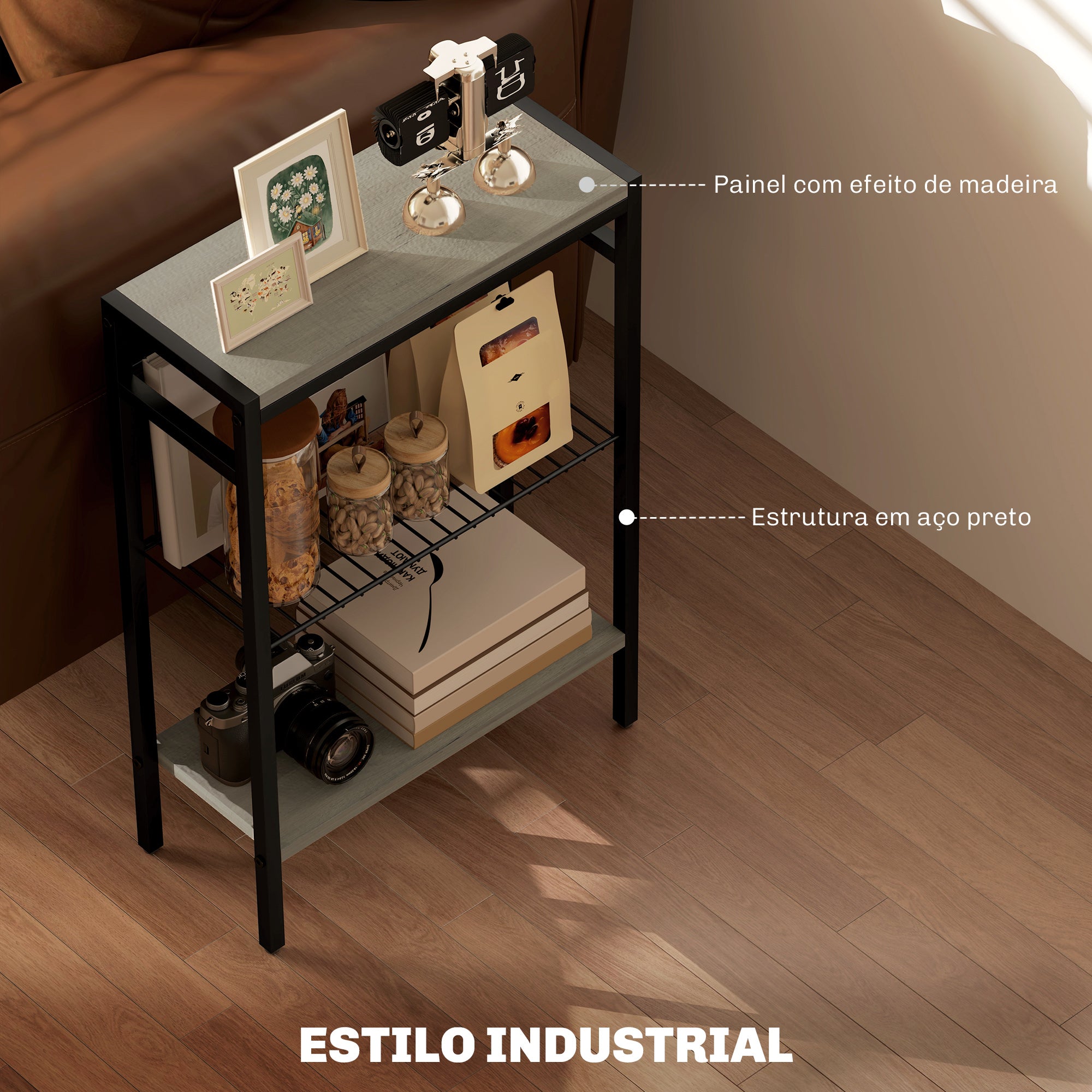- TRÊS PRATELEIRAS: Esta mesa auxiliar de estilo industrial tem três prateleiras perfeitas para arrumar ou expor livros, caixas e decorações. Além disso, a prateleira do meio inclui um painel traseiro que impede os objetos de caírem