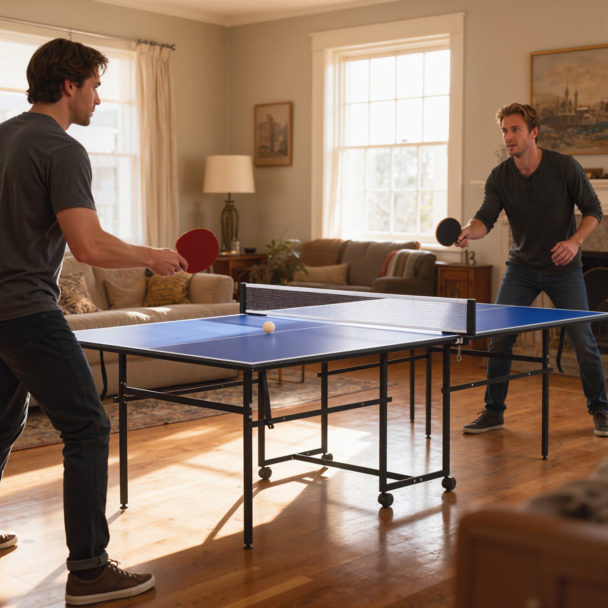 - Esta mesa de ping pong com rodas é ideal para jogadores profissionais e amadores Dobra·se facilmente e possui um sistema de bloqueio para a manter firmemente na posição fechada Possui 4 rodas com travões para facilitar a deslocação e mantê·la estável durante a utilização Os pés de borracha ajustáveis nivelam a base em pisos irregulares e evitam riscos Fabricado em MDF e aço, é robusto e duradouro, adequado para utilização no interior e no exterior Perfeito para salas de jogos, ginásios, escritórios e outros espaços Inclui uma rede, duas pás e três bolas para que possa começar a jogar de imediato