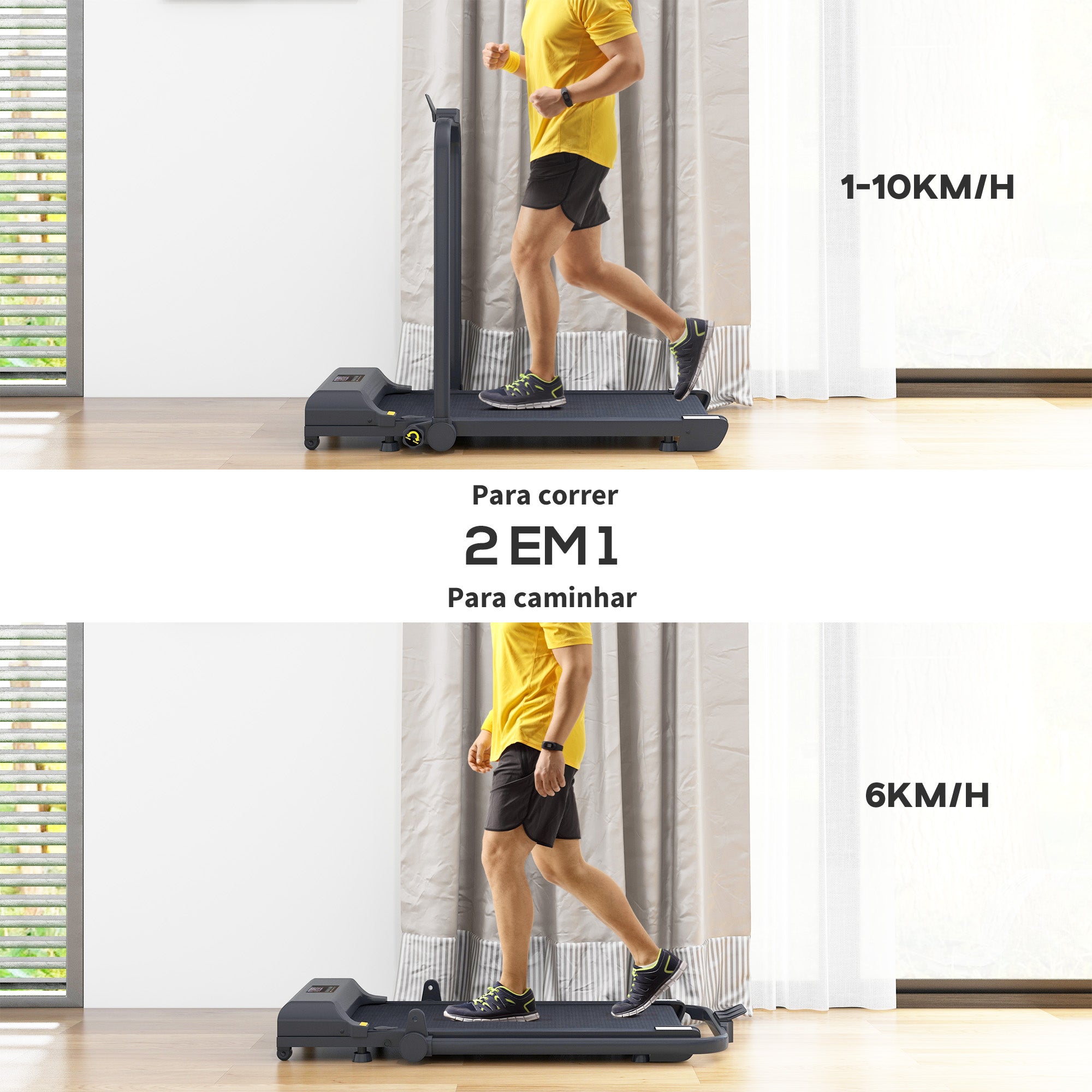 - 2 MODOS DE UTILIZAÇÃO: Escolha entre o modo de corrida (1·10 km/h) ativado ao levantar o apoio de braços e o modo de caminhada (até 6 km/h) ao abaixá·lo. O motor potente de 2,5 CV e silencioso garante um ambiente tranquilo e minimiza o impacto