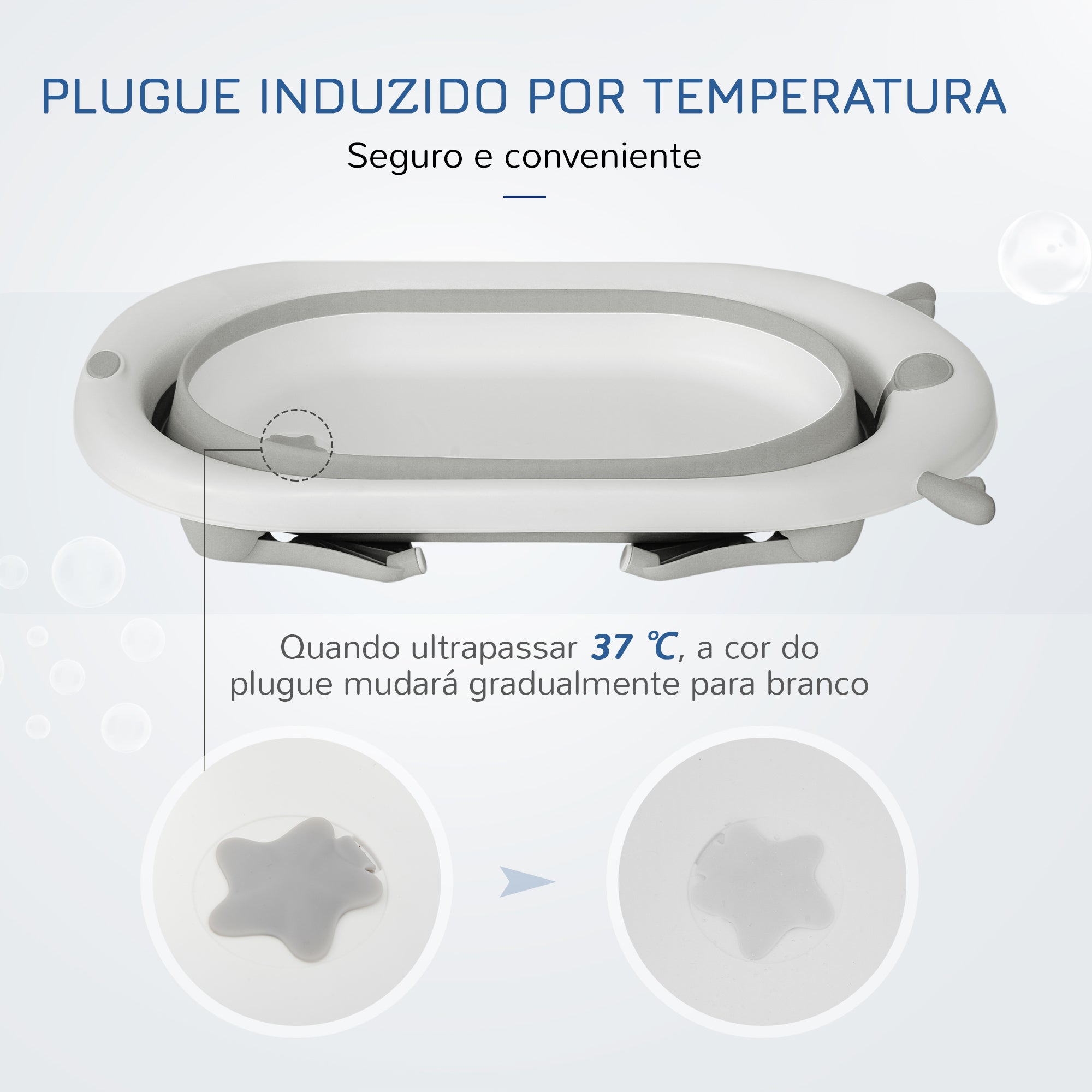 - PLUGUE TERMOSSENSÍVEL: A tampa do orifício de drenagem desta banheira muda de cor induzida pela temperatura. Quando a água ultrapassar 37 ?, como um aviso e segurança, a cor da tampa ficará gradualmente branca.