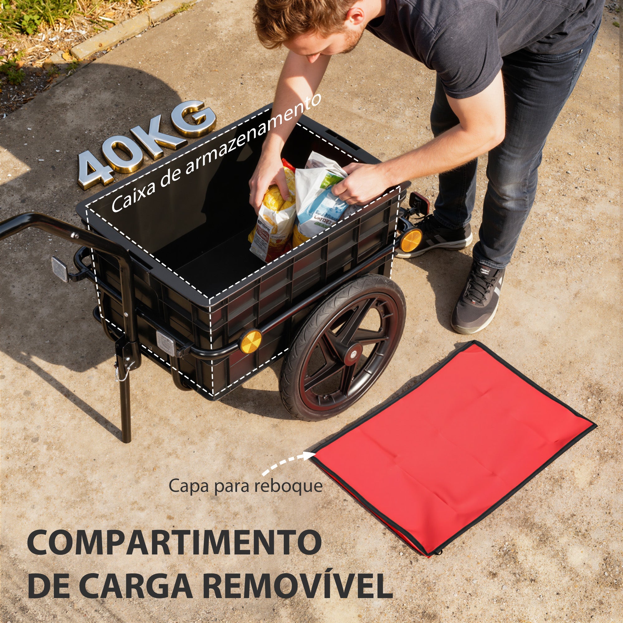 - MEDIDAS TOTAIS: 144x59x80 cm (CxLxA). Medidas interiores: 61x42x30 cm. Capacidade: 70 L. Carga máxima: 40 kg. O reboque para bicicleta requer montagem O pacote inclui: ? 1 x Reboque de bicicleta; ? 1 x Manual de instruções Este reboque de bicicleta da HOMCOM com tampa vermelha permite·lhe transportar facilmente todo tipo de cargas: compras, bagagem, caixas ou ferramentas. Com capacidade de 70 L e estrutura de aço com lona Oxford impermeável, combina resistência e praticidade. Graças ao seu sistema de acoplamento universal e seus refletores, poderá utilizá·lo com segurança tanto de dia como de noite. Também pode ser usado como carrinho de mão independente graças às suas alças integradas.