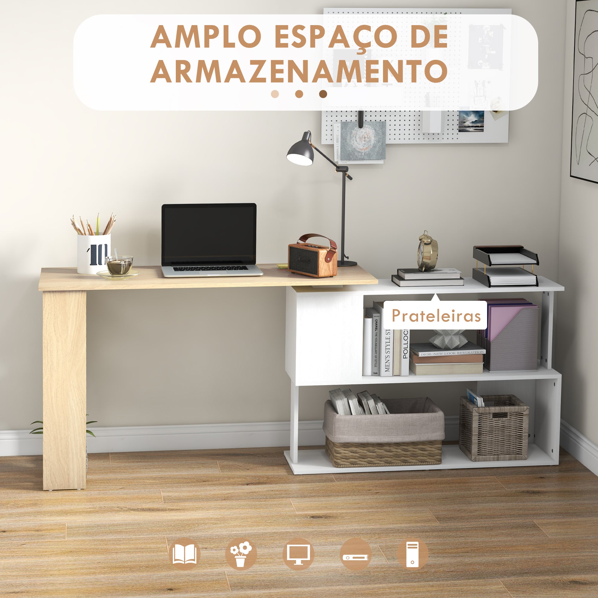 Mesa de Computador Secretária Mesa de Canto Giratória 360° com 5 Prateleiras para Casa Escritório Madeira e Branco