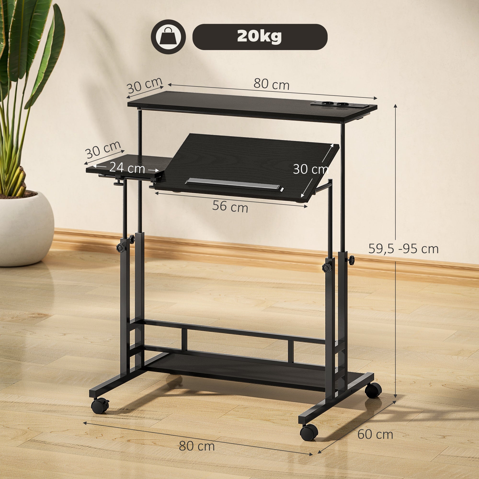 - MEDIDAS TOTAIS: 80x60x59,5·95 cm (CxLxA). Carga máxima: 20 kg no total, com capacidade de 5 kg na superfície e 5 kg na prateleira inferior. Compatível com cadeiras até 45 cm de altura. Requer montagem O pacote inclui: ? 1 x Secretária de pé; ? 1 x Manual de instruções; Otimize o seu espaço de trabalho com esta secretária de pé moderna da HOMCOM. Com três superfícies, incluindo uma central inclinável, e altura ajustável entre 59,5 e 95 cm, permite trabalhar sentado ou de pé com facilidade. Conta com ligação elétrica integrada, rodas práticas para facilitar a mobilidade e um design moderno. É ideal para trabalho, estudos e projetos criativos