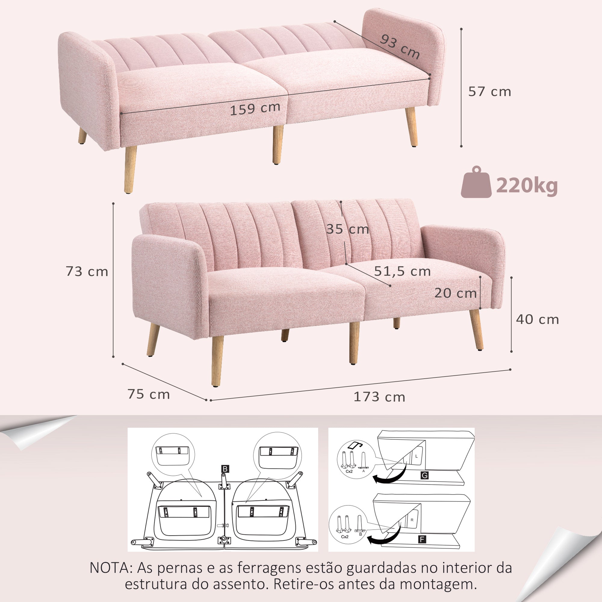 Sofá Cama de 2 Lugares com Encosto Ajustável em 3 Posições Apoio para os Braços Desmontável e Pés de Madeira Sofá Duplo Moderno para Sala de Estar Escritório 173x75x73 cm Rosa