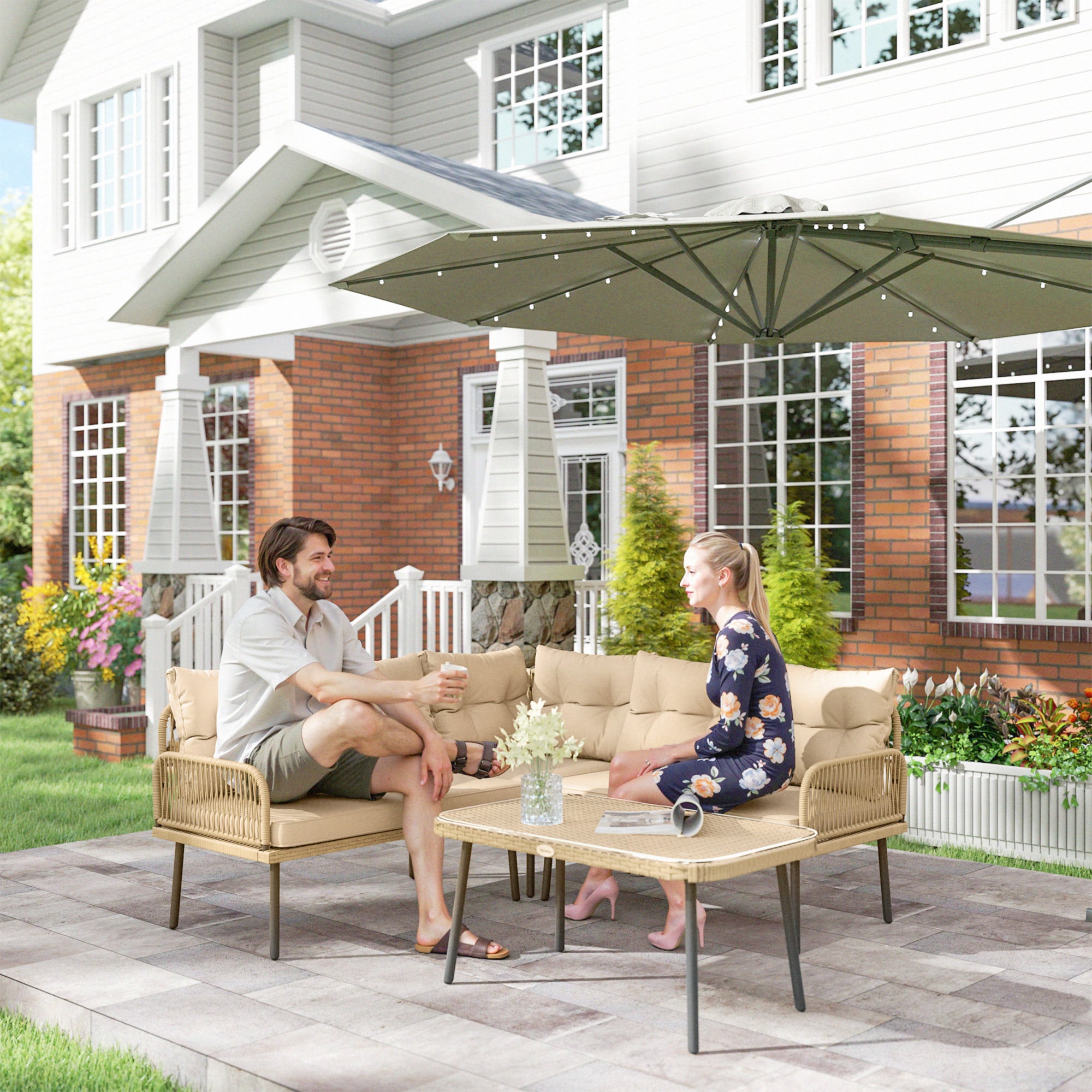 Conjunto de Jardim de Vime Sintético de 4 Peças Móveis de Exterior em Forma de L Inclui 2 Sofás de 2 Lugares 1 Canto de Sofá 1 Mesa de Centro com Almofadas Madeira e Bege
