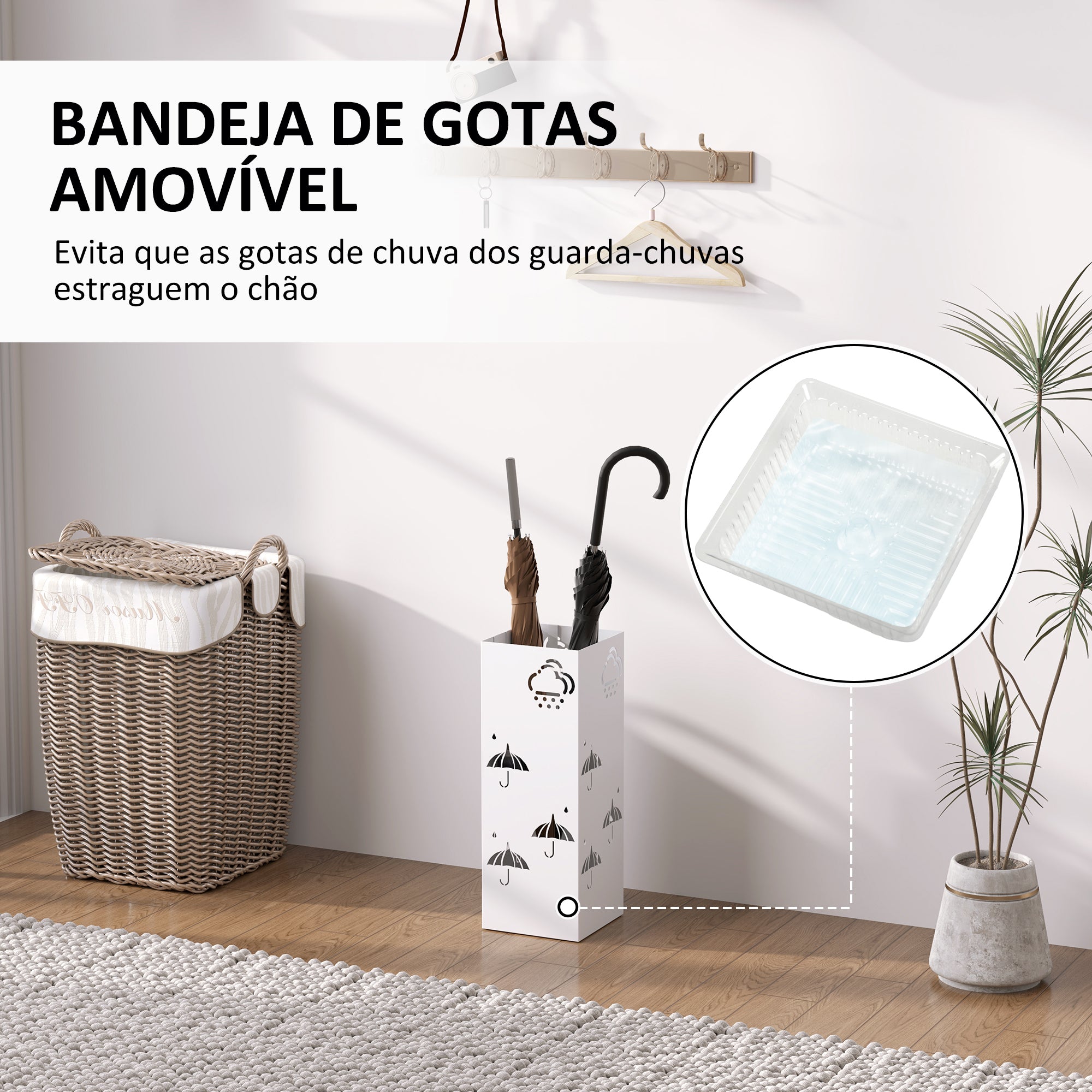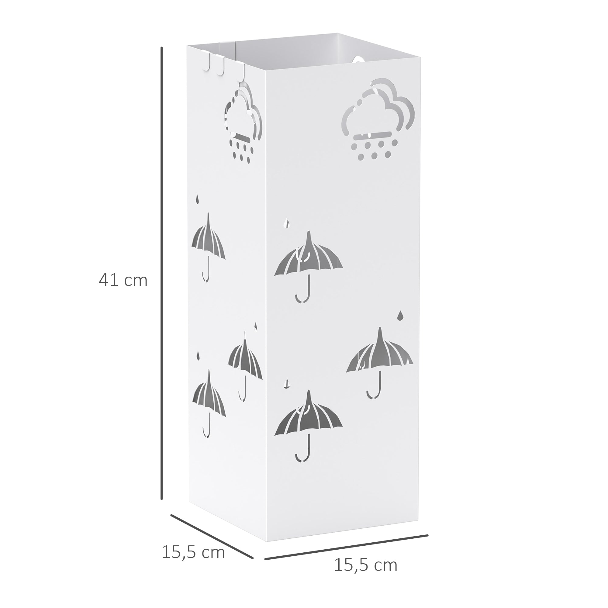 Suporte para Guarda Chuva de Aço Suporte para Guarda Chuva com 4 Ganchos e Bandeja de Gotejamento Amovível Suporte para Guarda Chuva Branco para Entrada Escritório 15,5x15,5x41 cm
