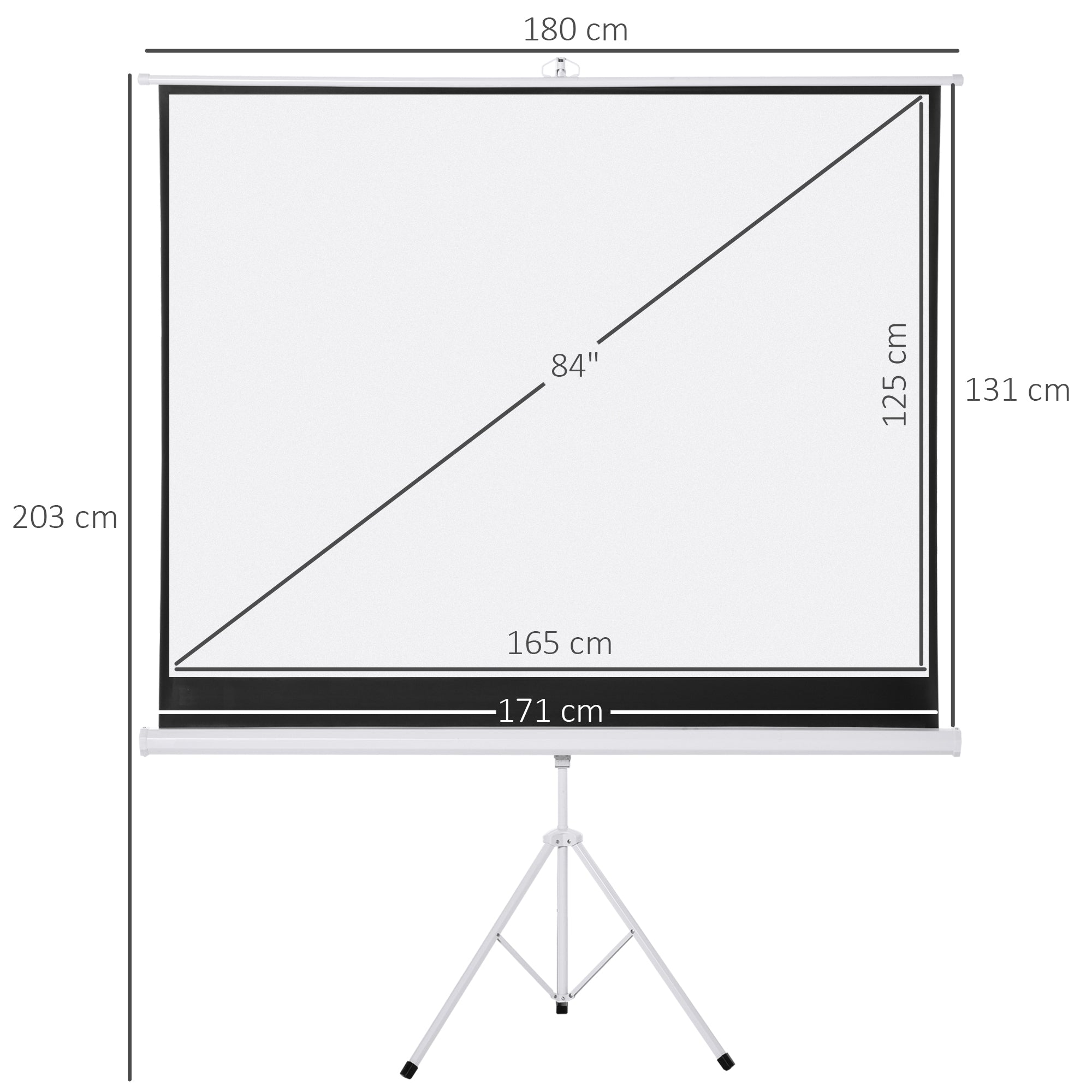 • Dimensões do ecrã: 84 pulgadas: 171x128cm (CxL), comprimento da caixa de metal: 189cm, altura máx.: 2.45m O ecrã de projeção de HOMCOM, junto com o suporte para tripé, oferece uma maneira económica de configurar o lugar onde o necessite. É a solução adequada para quase qualquer apresentação de projeção de vídeo em interiores ou exteriores. Simplesmente monte o ecrã no suporte do tripé estável, puxe o ecrã para cima e coloque no seu lugar, depois pode aproveitar ao máximo. O ecrã branco com a borda negra permite o foco e alinhação ótima da imagem. Perfeito para a casa, o escritório, a aula ou qualquer outro lugar necessário!