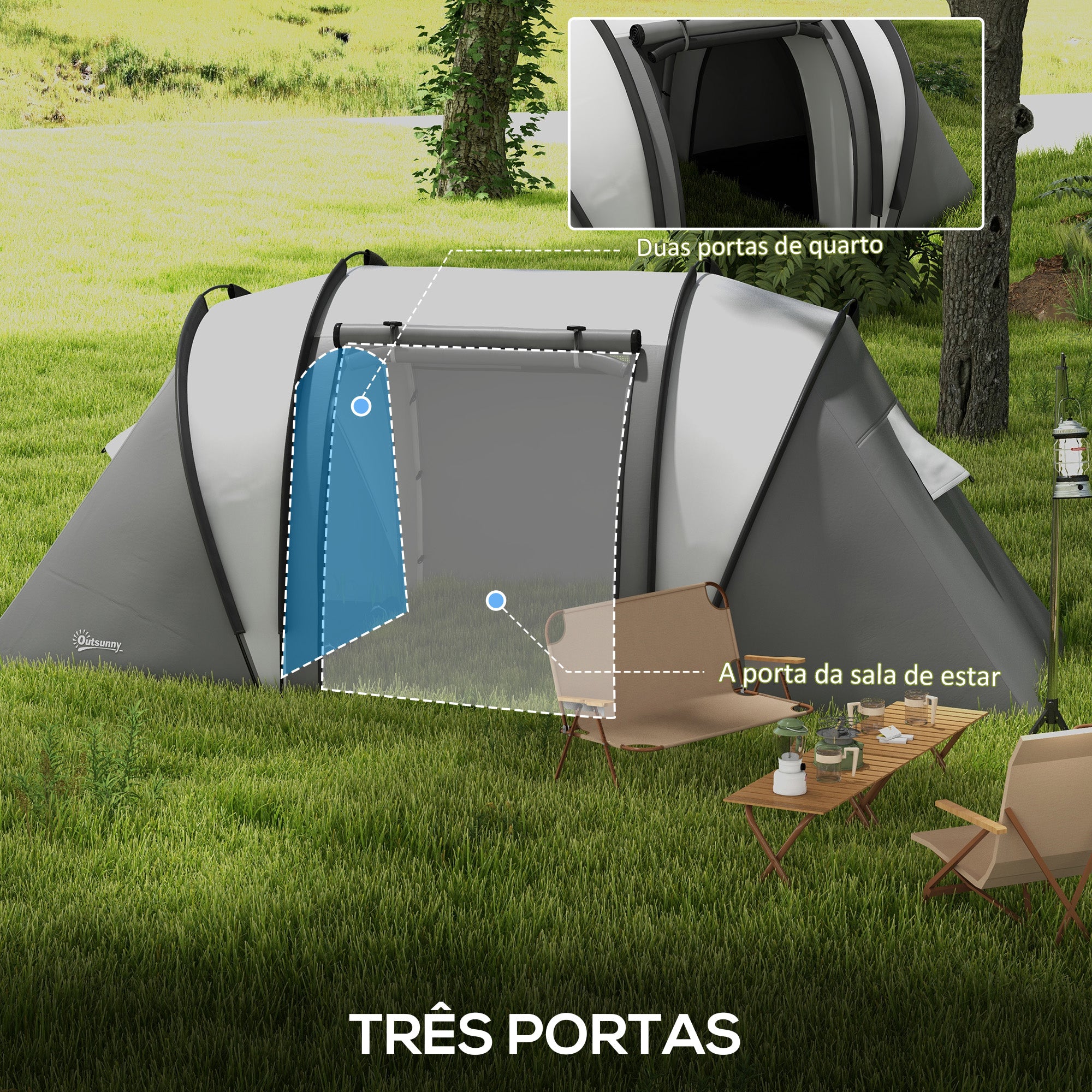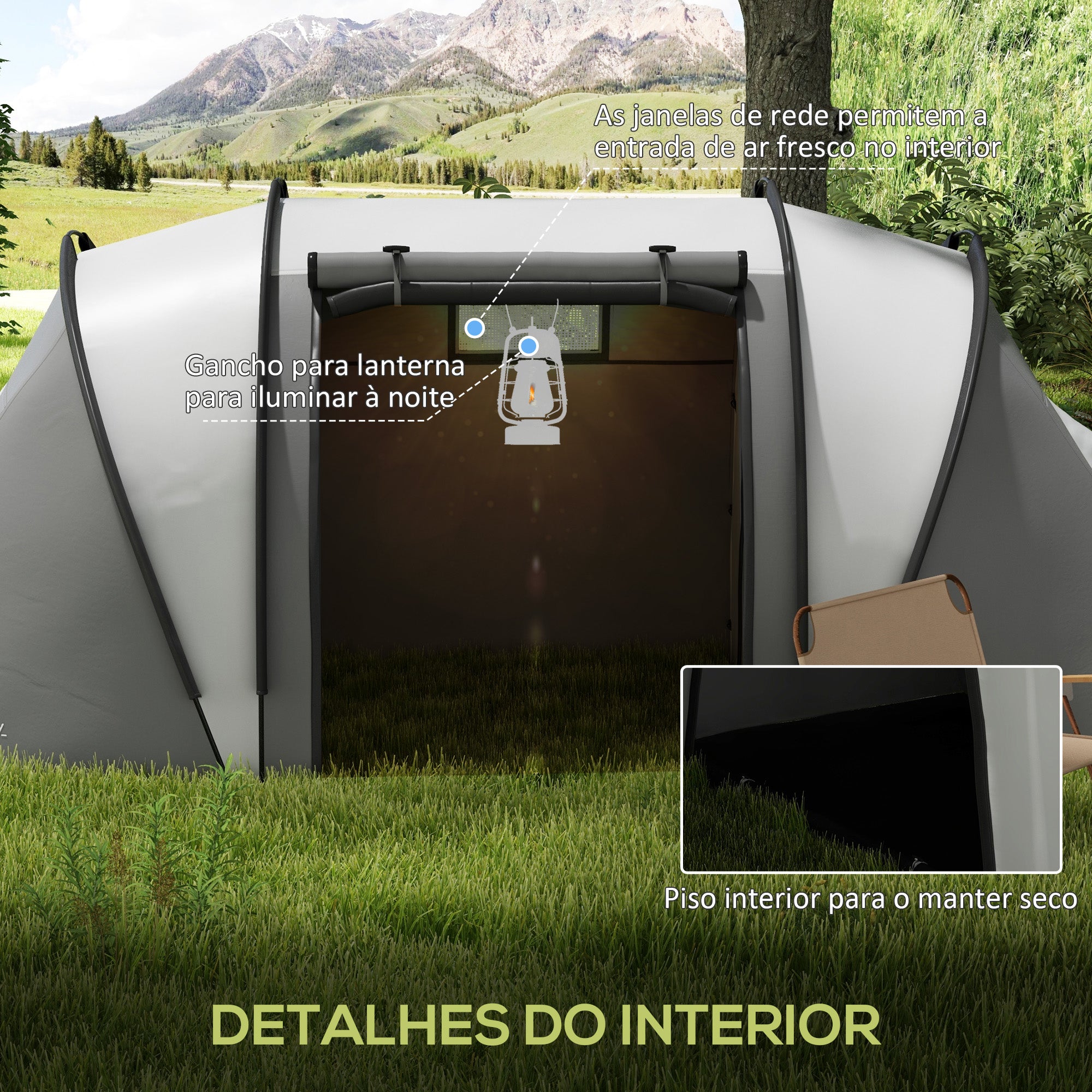 Tenda de Campismo Familiar para 4-5 Pessoas Tenda de Campismo Túnel Impermeável 3000 mm com 2 Quartos Bolsa de Transporte e Gancho Ideal para Caminhadas e Pesca Cinzento