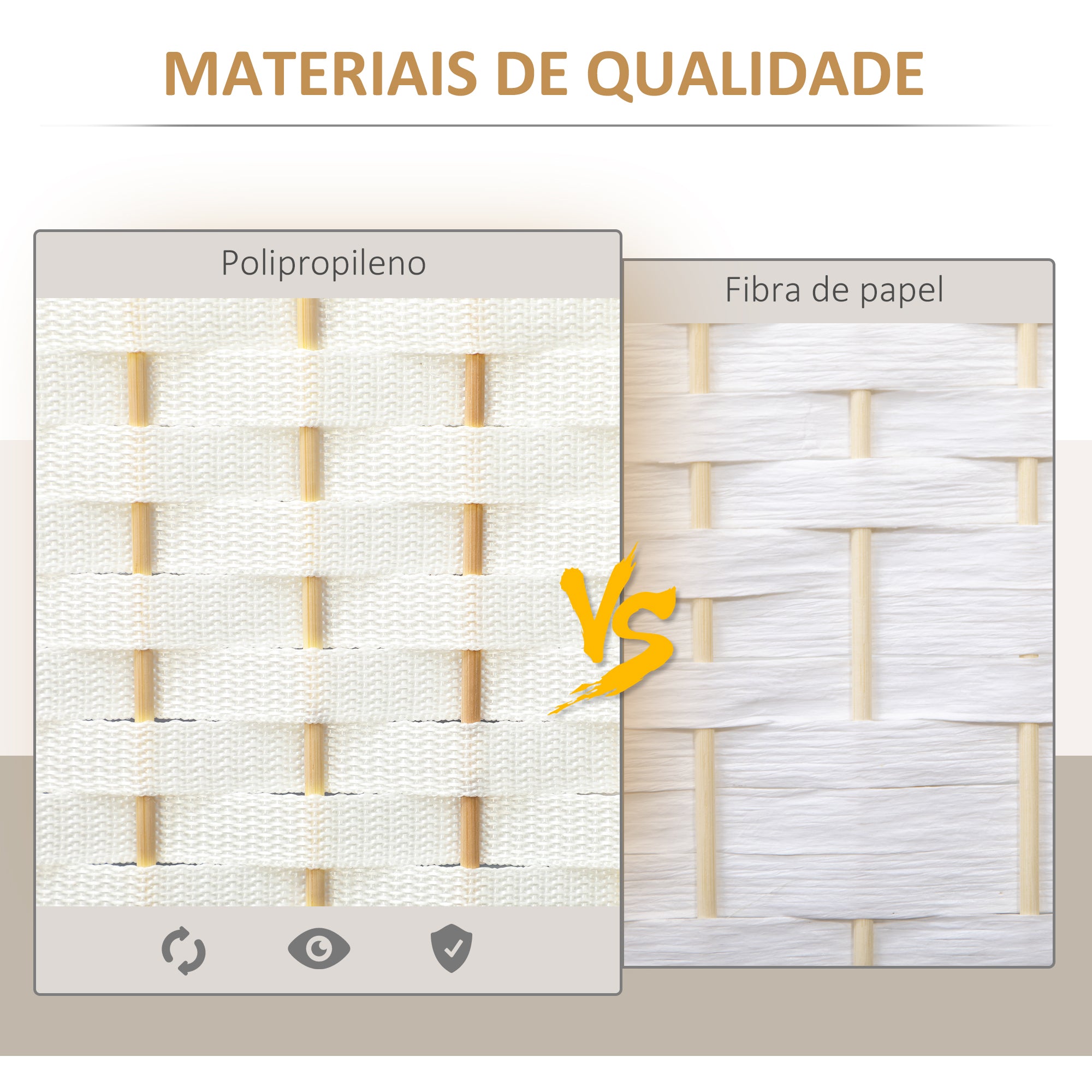 - 1 x Manual de instruções Transforme os seus espaços com facilidade utilizando este biombo. A sua construção em polipropileno oferece uma privacidade superior e maior resistência do que as fibras de papel tradicionais. Esta divisória portátil combina funcionalidade e estilo com um desenho dobrável de seis painéis e quinze dobradiças metálicas. A sua elegante estrutura arqueada em madeira de pinho e o tecido de polipropileno dão um toque sofisticado, perfeito para qualquer espaço que necessite de maior privacidade