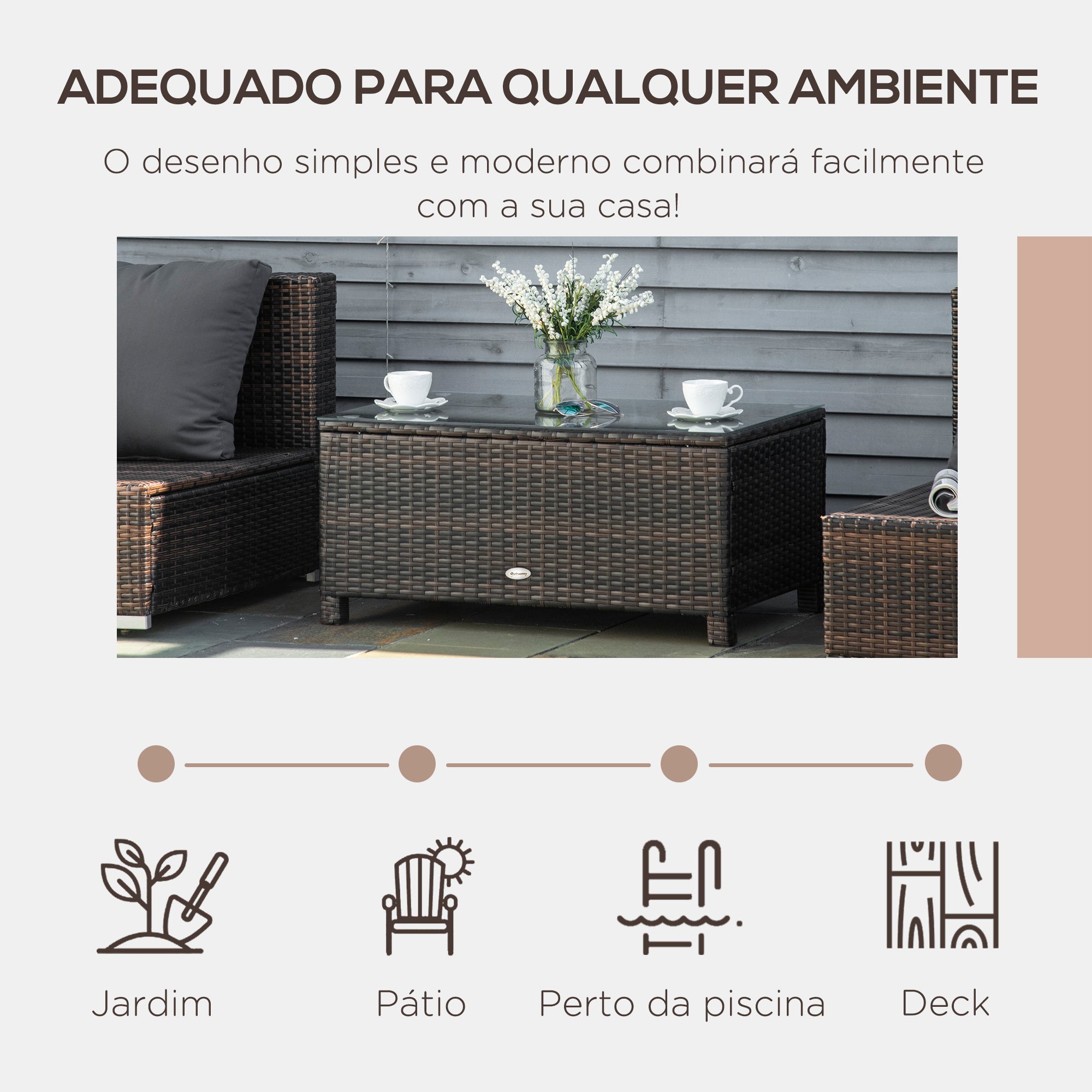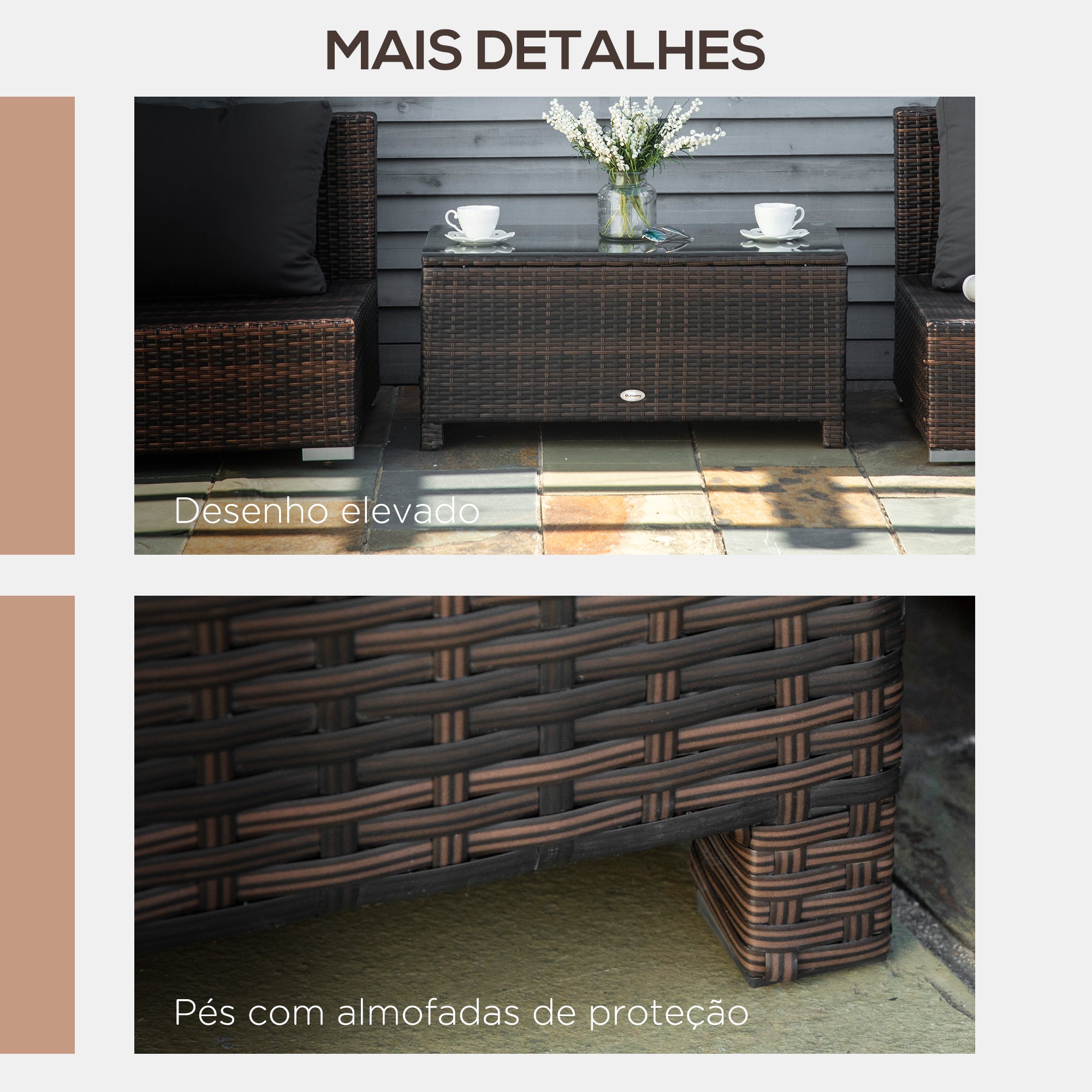 - MEDIDAS TOTAIS: 85x50x39 cm (CxLxA). Capacidade máxima de peso: 50 kg. Requer montagem Traga um toque de estilo ao seu espaço exterior com esta mesa de centro de vime para jardim da Outsunny. Fabricada com estrutura em aço e revestimento em vime PE, esta mesa lateral de exterior é resistente e ideal para uma utilização prolongada. Conta com uma bancada em vidro temperado resistente e fácil de limpar. Graças a combinação dos materiais, desenho e cor neutra, esta mesa de apoio de exterior combinará facilmente a qualquer ambiente, seja na varanda ou ao lado do seu conjunto de móveis de exterior