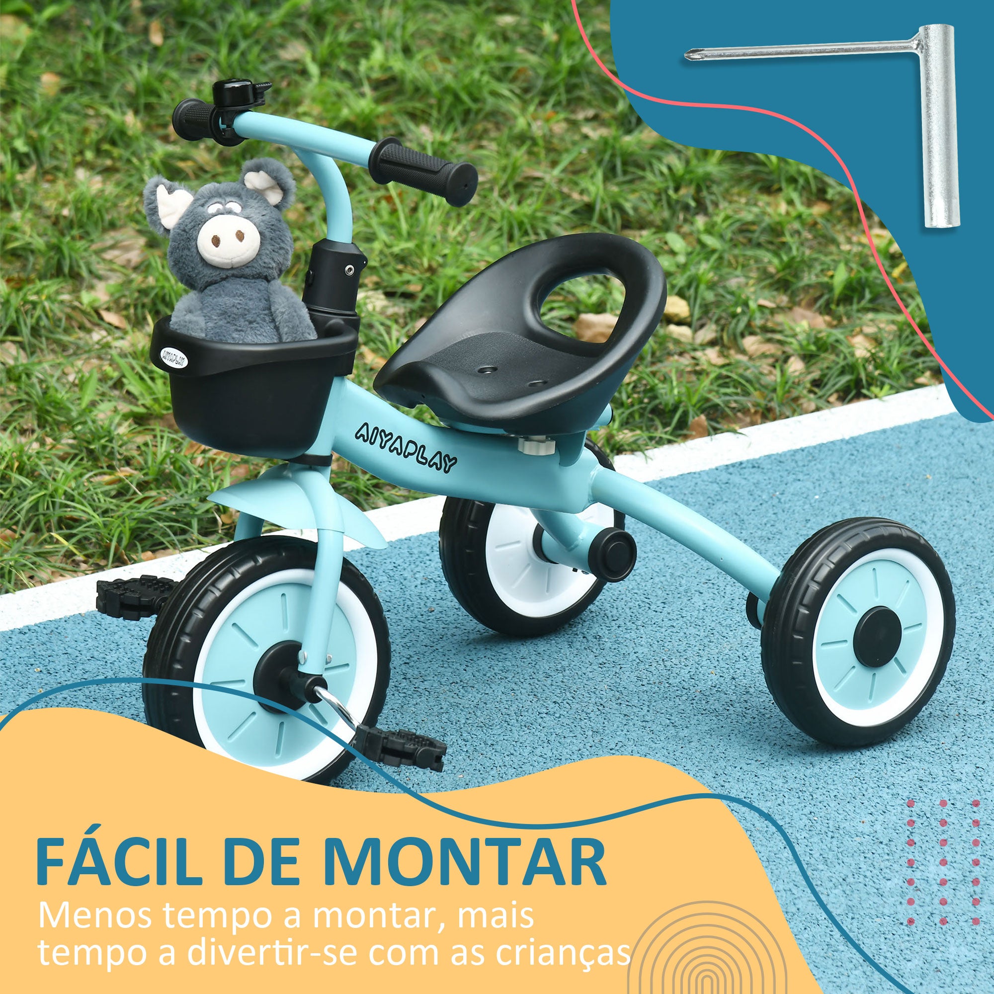 - 5 anos. Requer montagem Deixem os pequenos embarcarem em inúmeras aventuras com este triciclo para crianças da AIYAPLAY. Fabricado com uma estrutura resistente e rodas de EVA, este triciclo é resistente e seguro. Esta equipado com uma campainha e um pequeno cesto para uma maior diversão. Além disso, o assento pode ser ajustado para frente e para trás, ideal para adaptarse a cada criança. Preparese para ver as habilidades do seu filho florescerem enquanto se divertem ao ar livre!